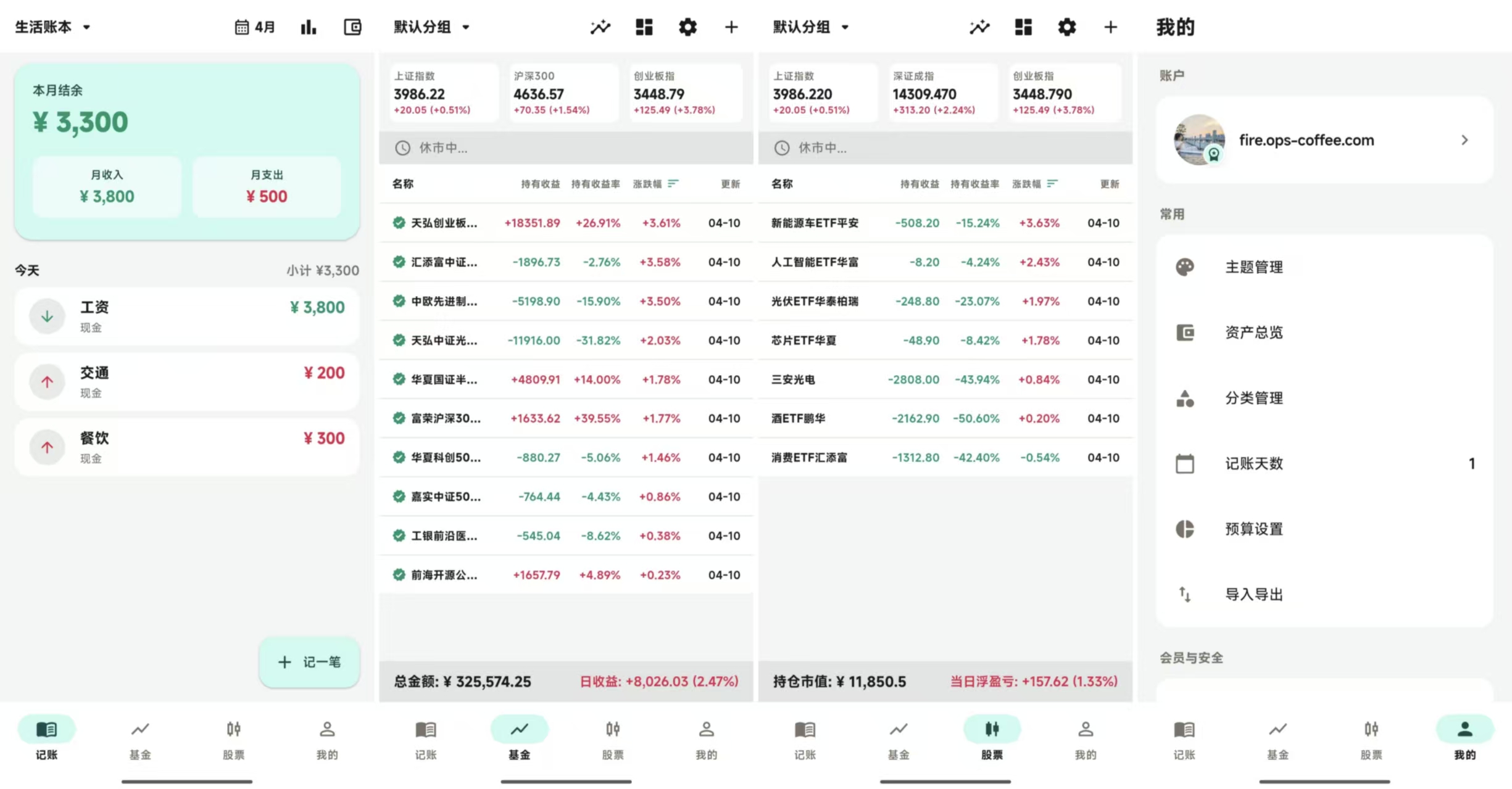 先简单的介绍下这个应用,让首次打开的朋友,有个直观的了解。这是一个集记账、基金、股票管理于一体的APP,主打一站式管理财务,主要源于我自己的需求:不想来回切换几个APP,也不想在几个地方记同样的东西,所以,记账、基金、股票这三块功能,我都放在一个应用里了