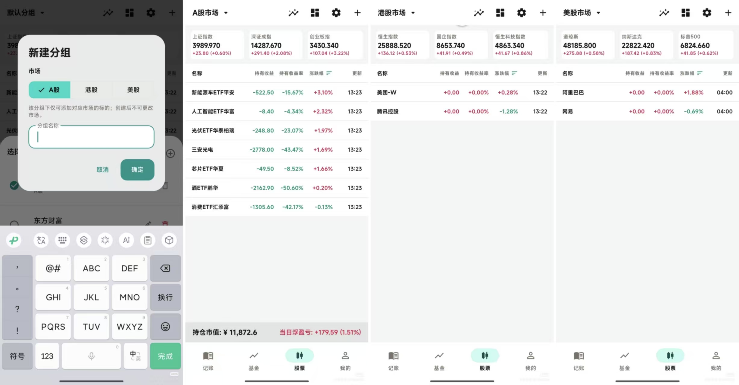 再次是股票,股票这边之前更偏A股自选与成本收益的计算思路。这次把美股、港股市场也接进来了:关注的范围更广,持仓结构更完整,和基金、记账放在一起做总览时,也更像一张像样的家庭资产负债表