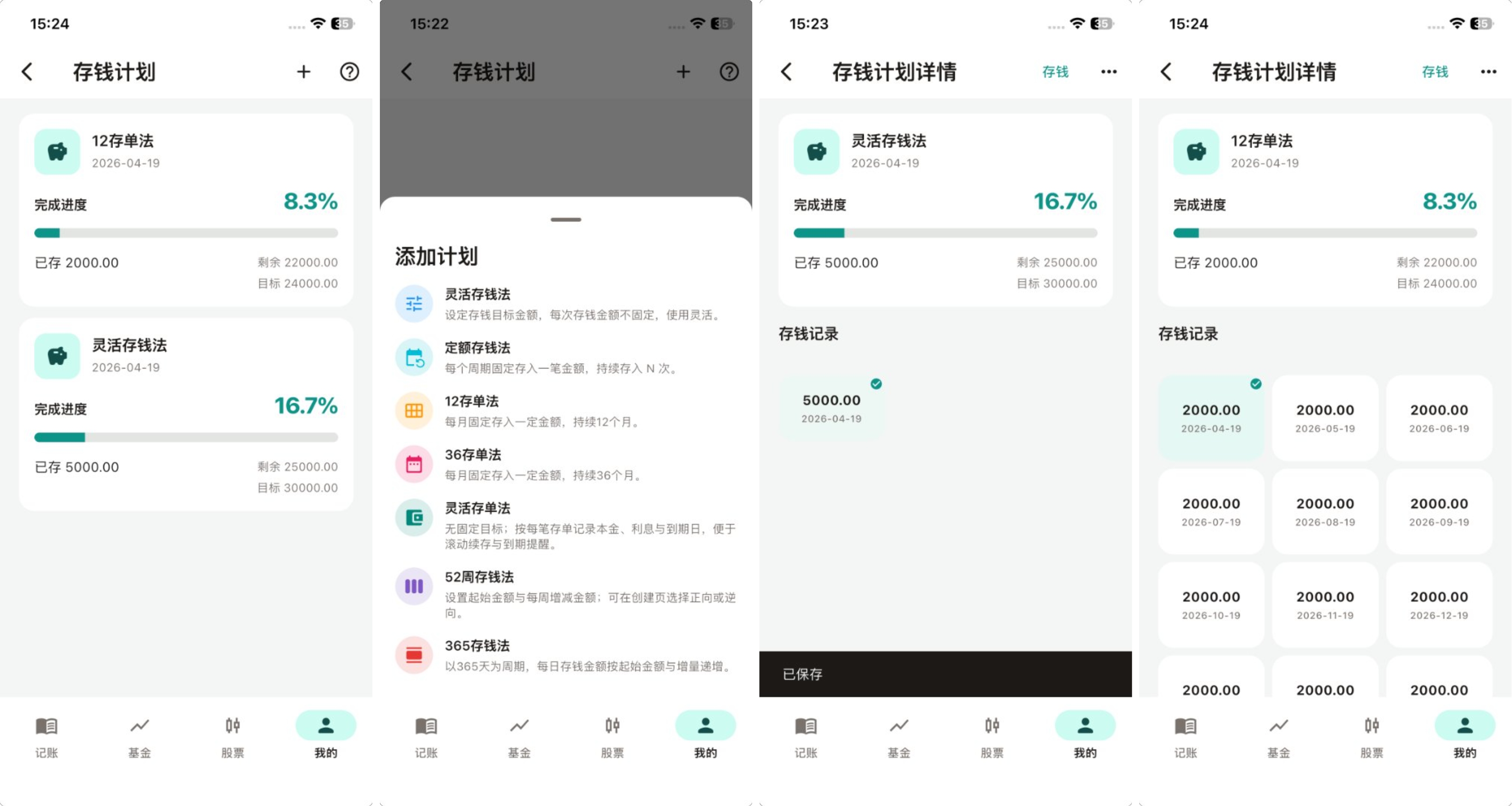 很多朋友有存钱的习惯,我刷抖音的时候也经常看到36期存钱法之类的短视频介绍,APP上线后有好几个朋友私信我希望增加存钱管理的能力,这一版上线了存钱计划。存钱计划内置了多种常见方法,例如灵活存钱、定额存钱、12 存单法、36 存单法、灵活存单、52 周、365 天等,你可以按自己的习惯选一种开跑。列表里看总进度,详情里看每一笔存钱记录,像 12 存单这类带节奏的方法,还用网格把每一期「该存、已存」摊开,更像一张贴在手机里的存钱路线图,清晰直观