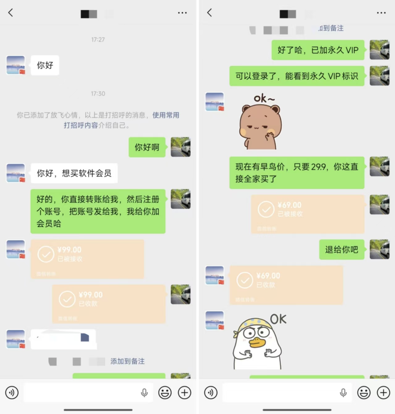 下午有个用户加了我好友,要买APP会员,直接转给了我99,这是APP内显示的终身会员的价格,看样子他是不知道现在有早鸟价,早鸟价只要29.9。钱我先收了,也把终身会员给他开通了,稍微纠结了一下,还是把差价退给了他,虽然他不知道有早鸟价的存在,也心甘情愿的花99块钱开通会员,但我不能让支持我的用户吃亏呀,不然自己心里也会过意不去的