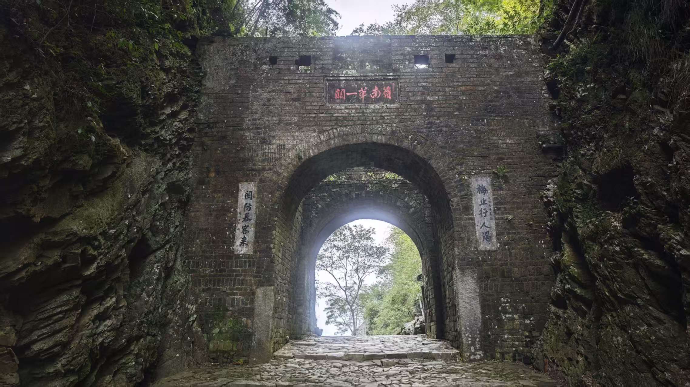 回头不停留就快多了,大概20分钟,就从广东侧的梅关古道入口到了山巅之上的梅关关楼,在广东一侧关楼的牌匾上写的是「岭南第一关」。关楼两侧还有一对联:梅止行人渴,关防暴客来