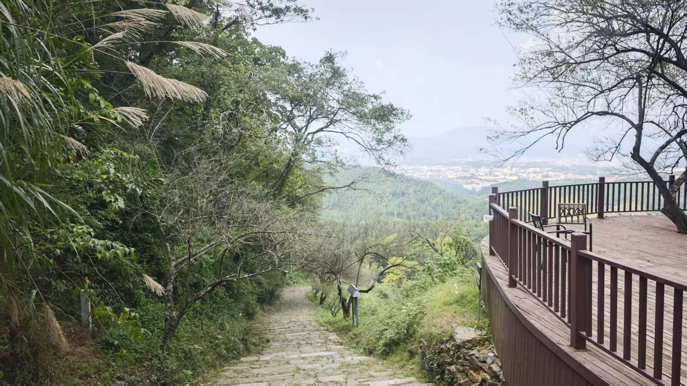 在关楼旁边的江西侧还建有观景平台,这里可以俯瞰山下风景,现在时间不对,如果是二三月份,满山梅花盛开,应该十分好看。下山了,整个景区大概花了近3个小时的时间,从江西侧上山,到山巅梅关,过关楼下到广东侧入口再折返,最终又从江西侧出去,完整走了个来回