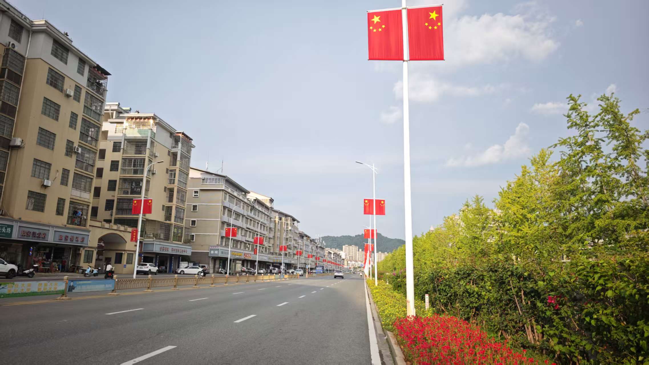 离开梅关古道就准备直接前往赣州西站了,路过大余县城,看道路中间的绿化带上种满了鲜花,路两侧的路灯上也挂满了国旗,一片节日的喜庆氛围,真的是要国庆了