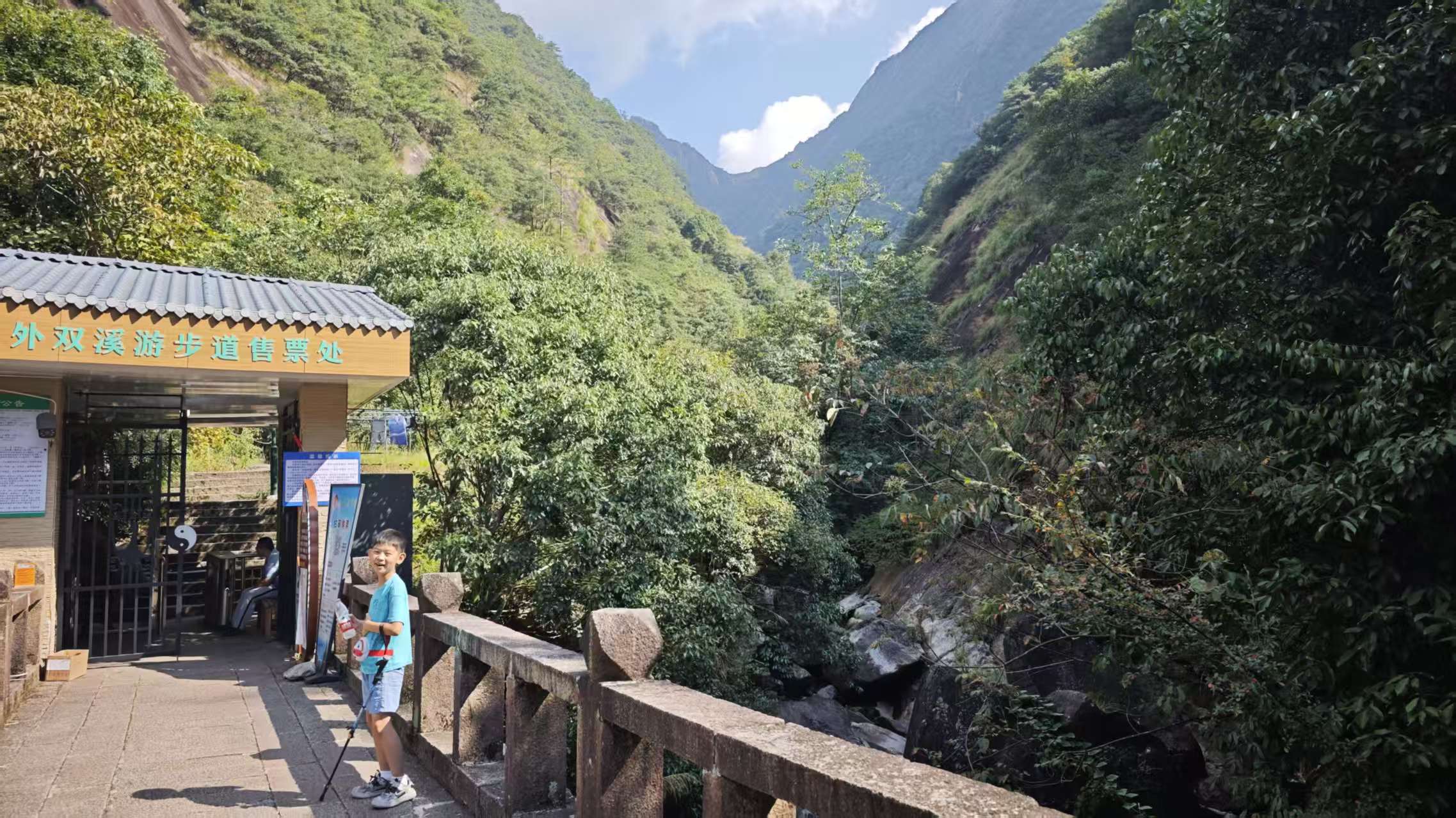 昨夜停车在了外双溪索道旁的停车场,三清山徒步登山的入口就在这旁边。想要早点出发的,可睡醒已经快9点,迅速起床,简单洗漱下,就去买早饭,索道口旁边有几家店铺,有卖早餐,油条鸡蛋豆浆,虽然价格稍微,但好在吃饱了,上山。徒步上山的入口不是很起眼,就在停车场门口,沿入口往前走几百米到了外双溪游步道售票处,在这里验票上山