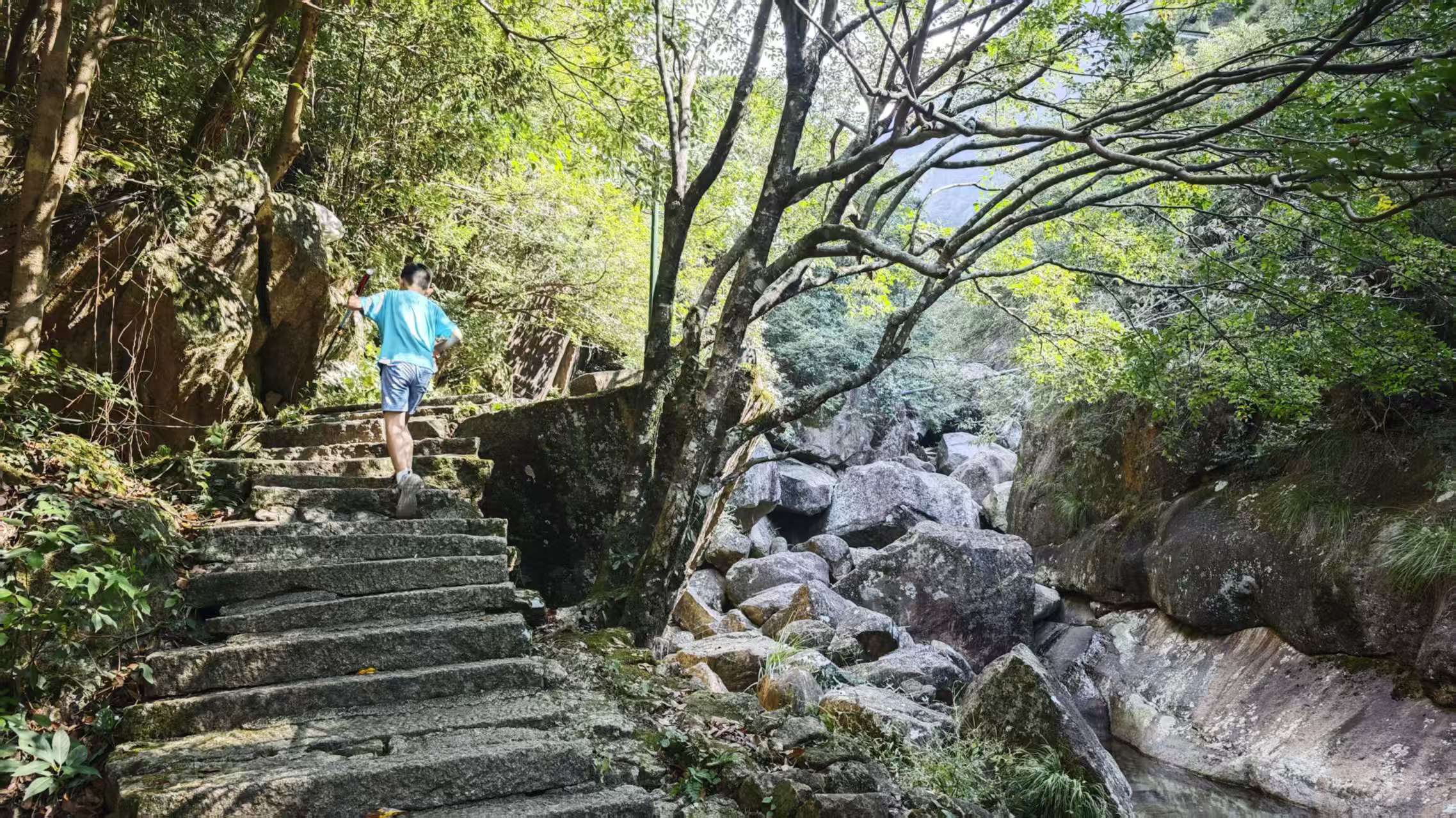 徒步上山,大概要走2.5公里能到索道的上站,一路的上行台阶,平缓的路段很少,难度不小。台阶旁是小溪,溪水干净,清澈见底,可爬山过程中也没空下去玩儿玩儿。无休无止的台阶,走走歇歇,抬头,缆车从头顶驶过,风轻云淡