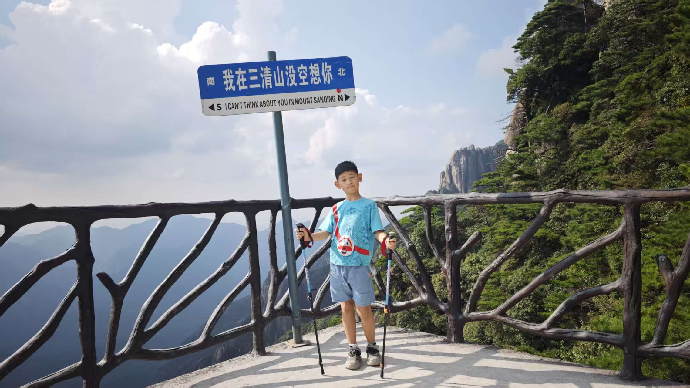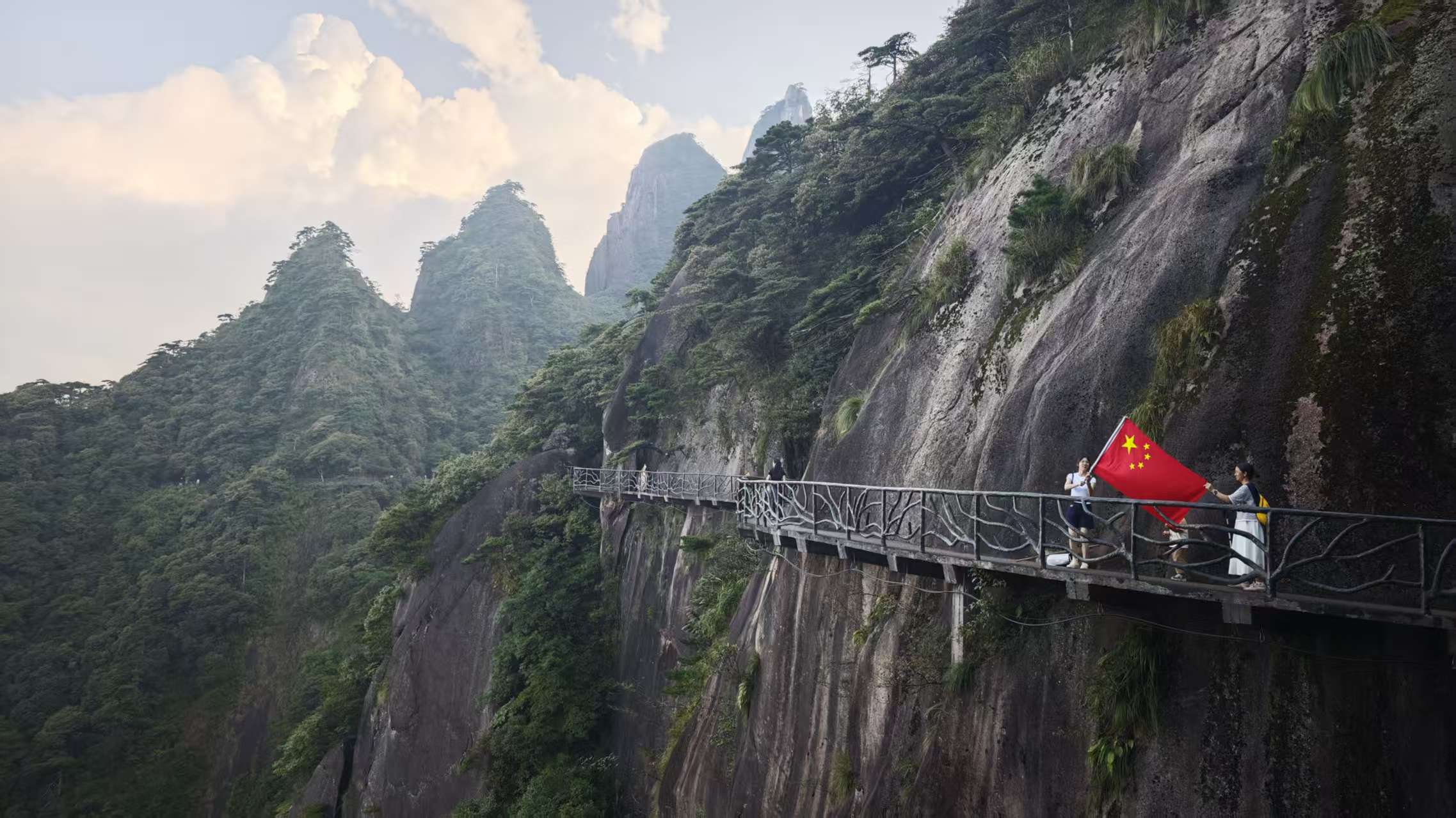这一路爬山,小家伙还是挺厉害的,虽然嘴上偶尔喊累,但完全爬得动,一直走在我们的前边,一点看不出来太累的样子。或许是我们选的路线的原因,还没走到三清山代表性景点最多的南清园景区,这一路感觉人流量还好,并没有感受到假期人挤人的盛况,遇到一队从广东来的朋友,他们还特意背上了国旗,让这条栈道上绽放了那一抹迷人的鲜红