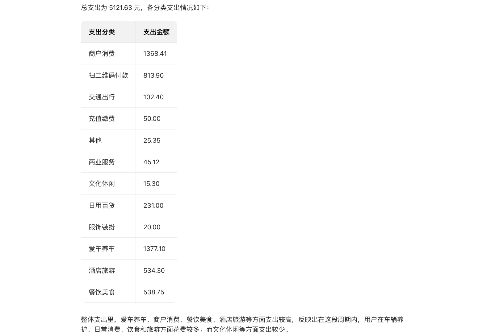 第二个月的花费要比第一个月多很多,主要原因是车子爆胎了一次,维修加换轮胎花费了1000元,此外最后这一周的时间,是一家三口,消费要比之前一个人时高不少,同时还去了两个收费的景区丹霞山和三清山,单单三清山的门票+索道也花了435。AI给出的这个月的的消费分类如下