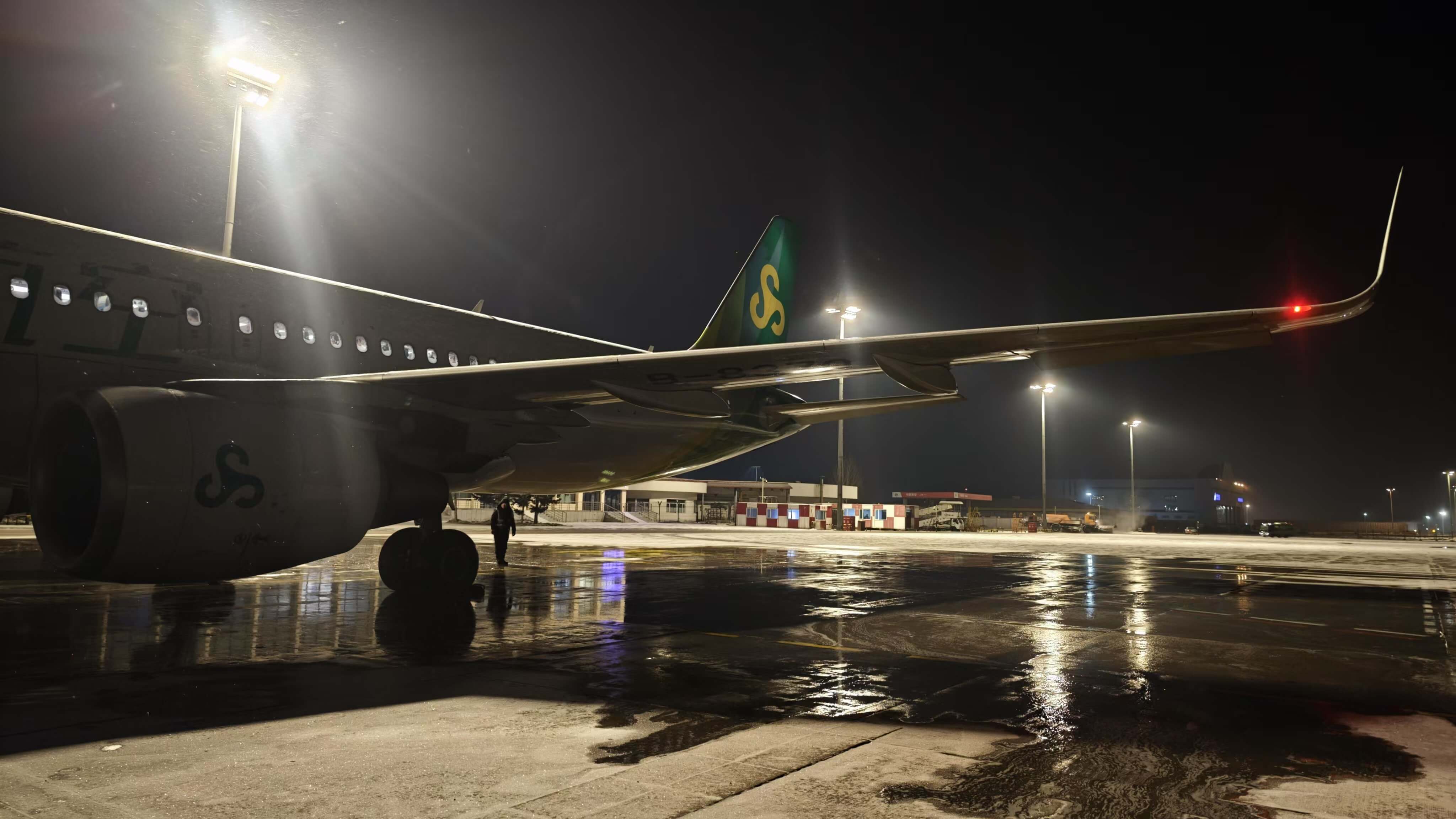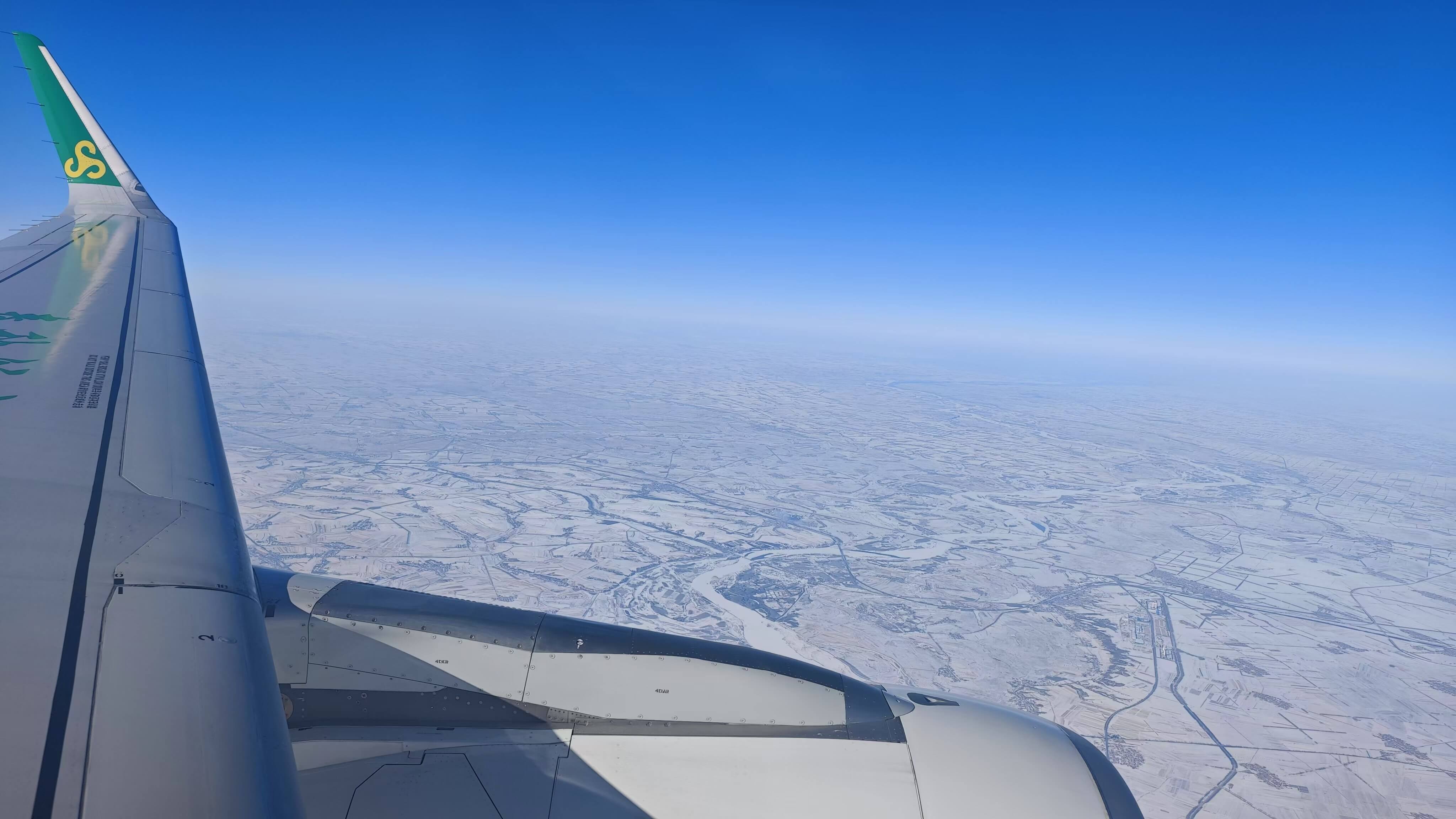 早上起的太早,飞机上接近三个小时的飞行时间正好可以用来补觉,起飞前离线下载了电影准备在飞机上观看,也就不用了。第一次坐春秋航空的飞机,才发现竟然没有免费的行李托运,也没有飞机餐,喝水都要自己买,好吧,也可能是因为我们买的机票便宜吧。说到机票便宜,我们是春节前订的机票,一家三口接近六千,以为提前订便宜的,但在出发前几天又看了一下,同样的航班要比我们购买时便宜了近两千,痛失两千,好心疼,所以对于机票来说,也不是越早买越便宜的,以后就有经验了。睡醒起来,已经飞到了东北上空,往下看冰雪覆盖大地