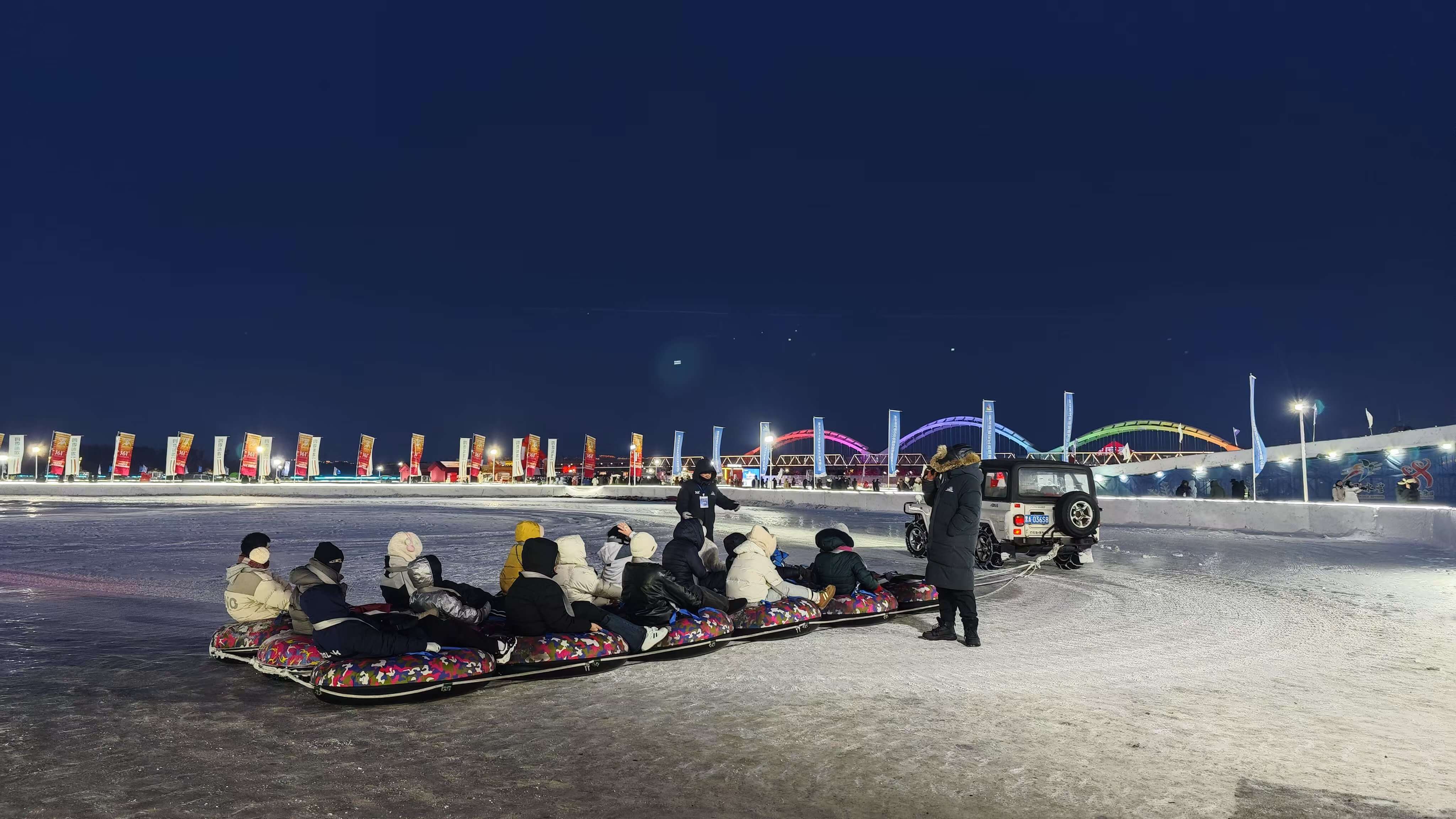 除此之外还有一些游玩儿项目是收费的,例如喂狍子、碰碰车等,进入园区二次收费,个人感觉体验稍差了。冰雪大世界另一个不容错过的项目就是这个冰雪大舞台,每到傍晚,当冰雕亮起霓虹,留着标志性小胡子的冰城左右哥就会带着游客在寒风中集体蹦迪,从野狼disco到亚冬会主题曲,成百上千人在雪地里跟着节奏挥舞荧光棒,连泰国舞团小姐姐都裹着貂皮大衣跳起东南亚热舞,场面魔性又热血,网上刷再多遍的短视频都不如亲子来现场感受一下