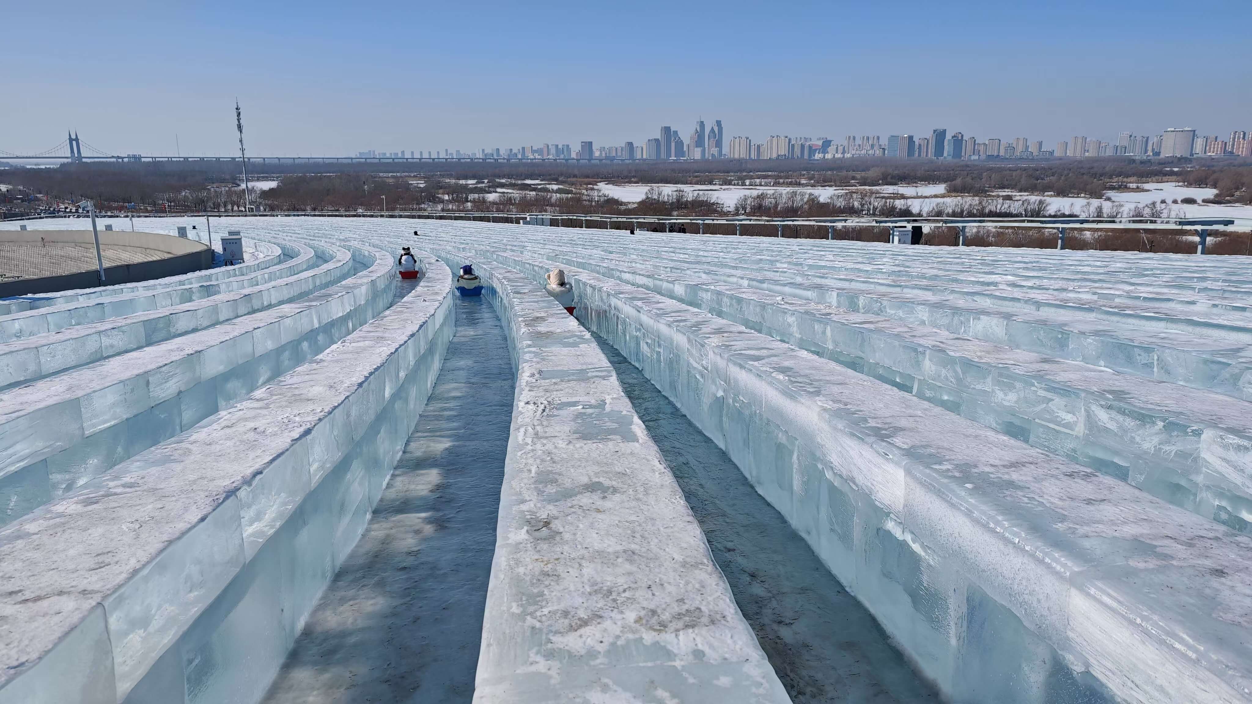 每年的冰雪建筑跟游玩儿设施都不太一样,今年冰雪大世界最为知名的游玩儿项目是大滑梯,有521米和365米两座,之前刷到视频排队大滑梯要好几个小时,所以进园区趁着人少就先把大滑梯给玩儿了,排队大概一个半小时,521米和365米的大滑梯都已经体验完成了,没有想象中那么刺激,但也还是挺好玩儿的,不过大滑梯不让小朋友玩儿,还是有点遗憾的