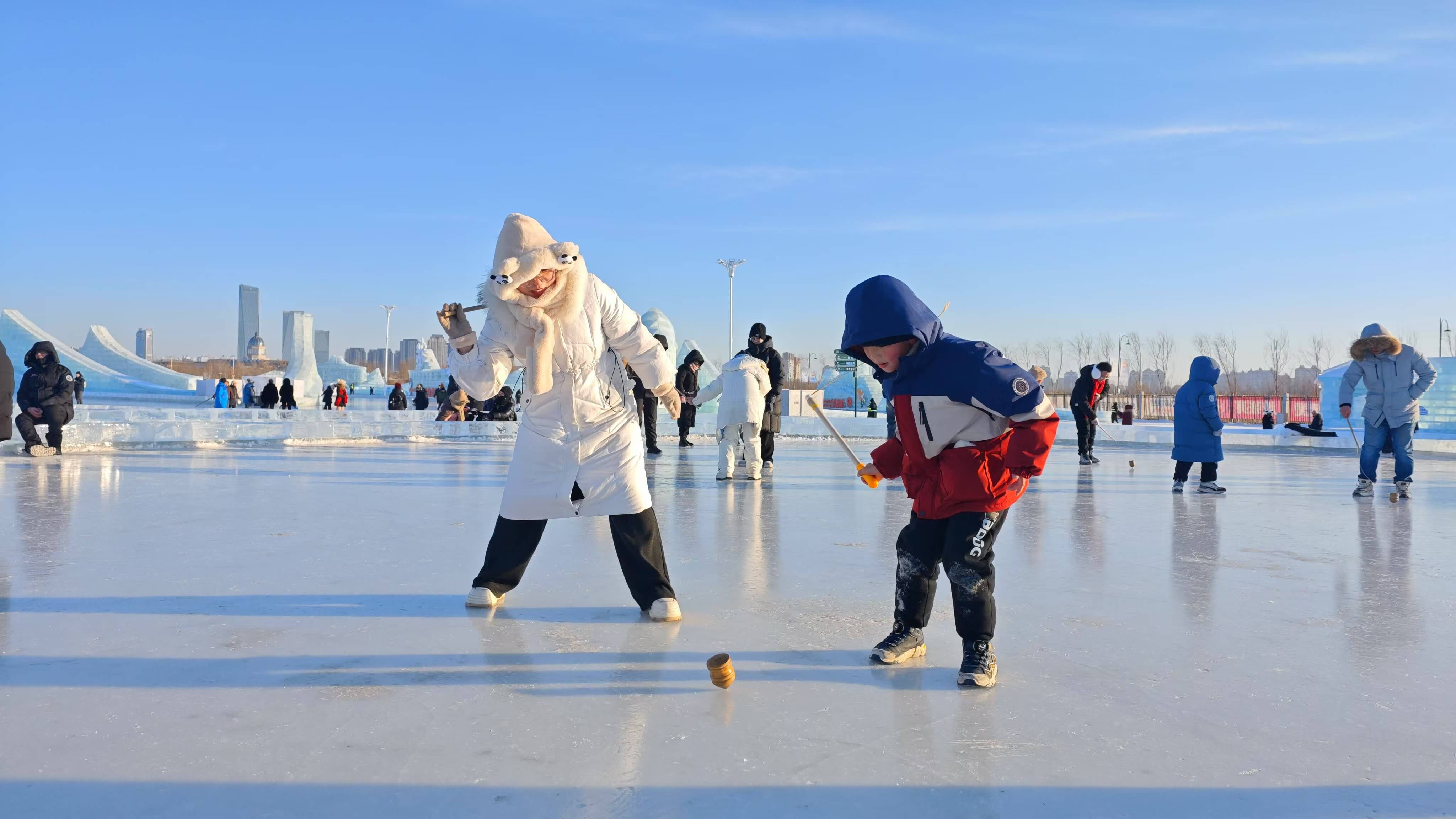 当天天气挺好,白天温度还不到零下十度,正常保暖,不会感觉太冷,除了几个需要预约的游玩儿项目外,园区内其他大部分的游玩项目都是不用预约的,到了排队进入即可,例如滑冰场、冰上自行车、冰上陀螺等等,小朋友昨天在松花江上刚刚学会了抽陀螺,现在兴趣正浓,又在这里体验了,旋转的陀螺在不断的抽打下,它的旋转速度更快了