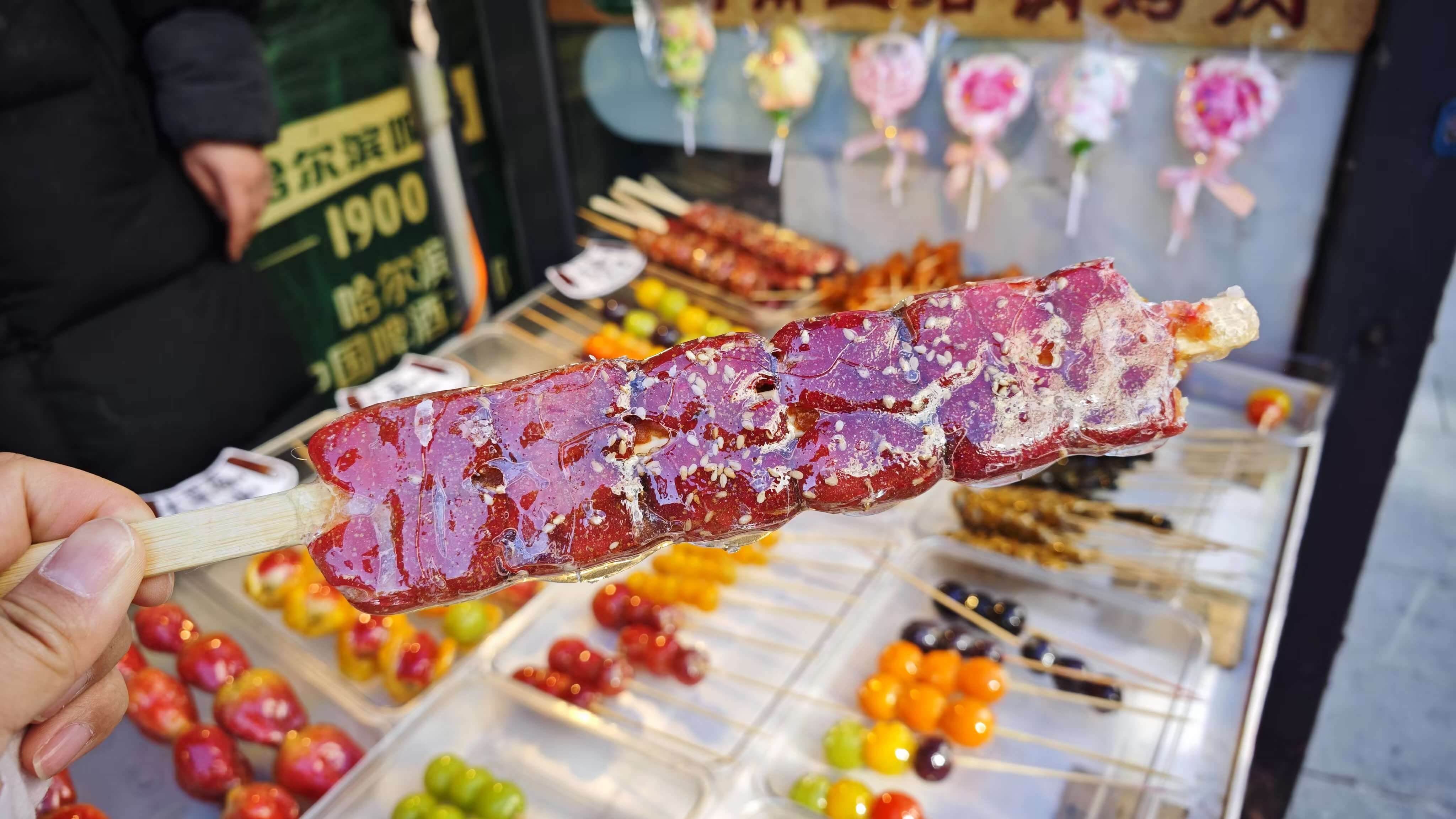 到了哈尔滨,也必须得吃串糖葫芦,这两天在街上看到了很多很多卖糖葫芦的,啥样口味的都有,山楂的、草莓的、黄瓜的、甚至是辣条的,但都没有买,在这里又见到了这种被压扁的冰糖葫芦,5块钱一串,酸酸甜甜,非常好吃,老板娘说他们家的是真的拿冰糖来做的