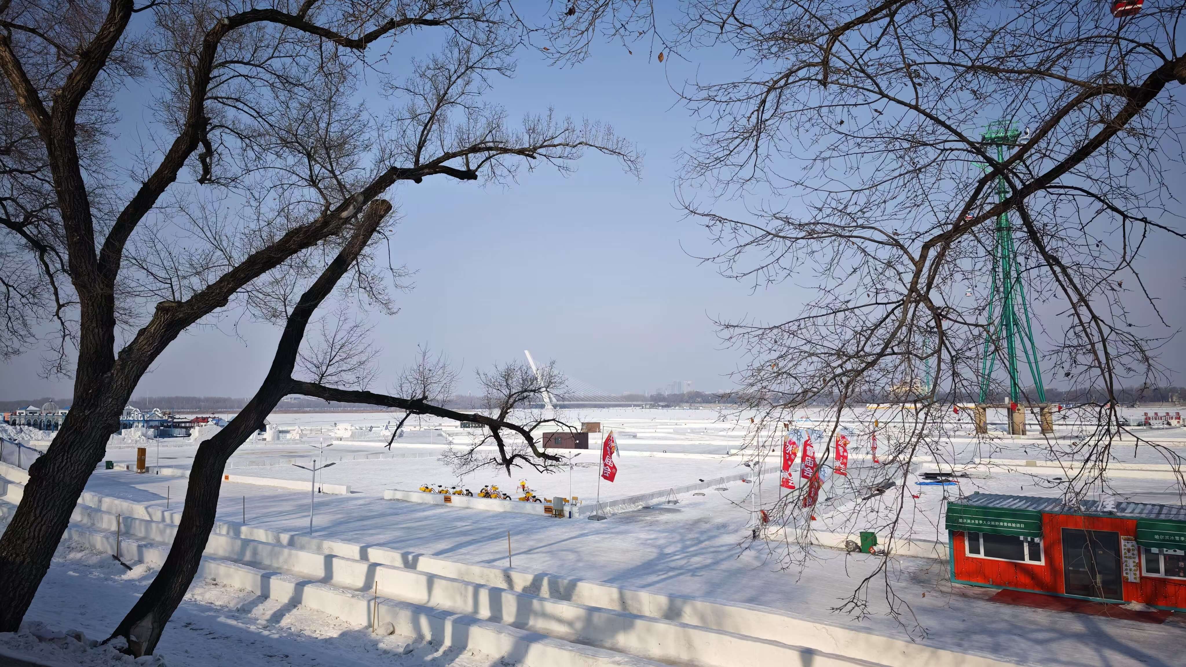 中央大街走到头是防洪纪念塔,为纪念1957年哈尔滨人民战胜特大洪水而建,塔高22.5米,象征城市的抗洪精神与英雄气概。再往前走就是松花江,此时的松花江已经被完全冰封,正在举办一年一度的松花江冰雪嘉年华,作为世界最大户外冰上乐园,这里不仅有传统的冰雪项目,如滑冰、冰钓、狗拉爬犁,还有刺激的冰上气垫船、雪圈极速漂移等创新玩法,由于天气太冷,准备不充分,缺少保暖护具,就没有尝试这个项目了