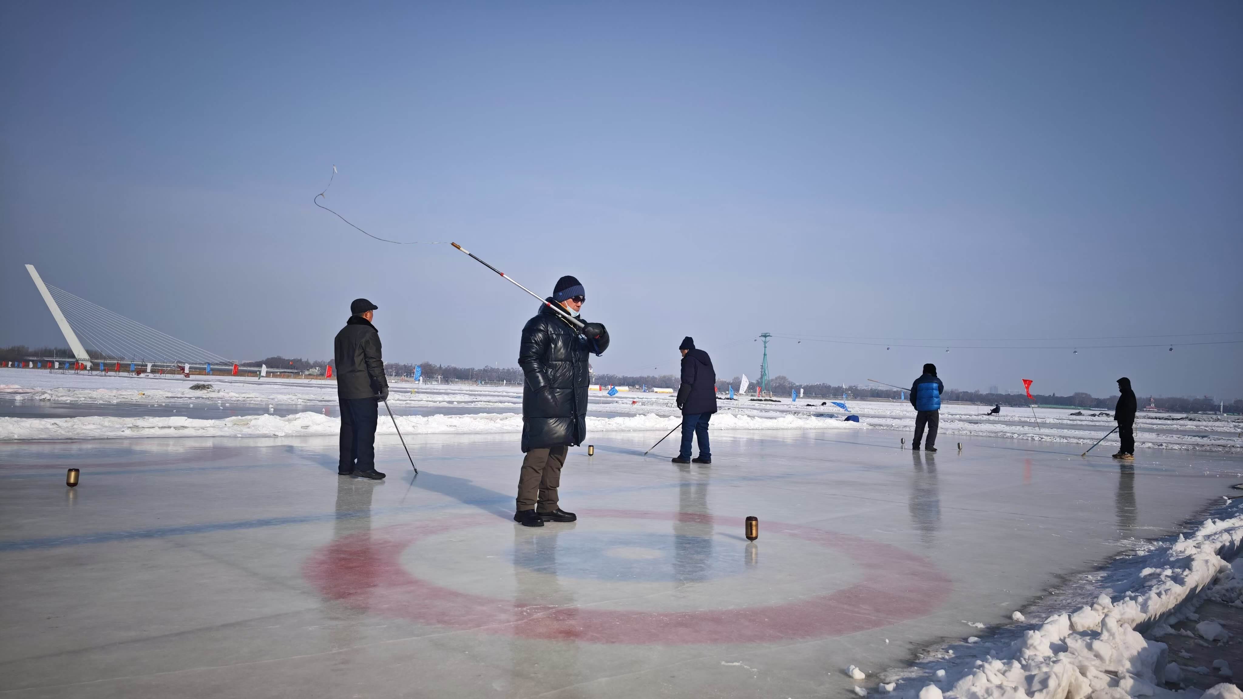 冰封江面,据说这冰至少有一米多厚,跑拉货的卡车都没有问题,那人走上去的话也是十分安全了,江边有阶梯可以下到松花江,直接走到冰面上,冰面之上被覆盖了一层雪,走上去很稳当,不用担心会滑倒,找一块冰面清掉上边的积雪就变成了冰上陀螺场,一群相熟的老人挥舞手中的鞭子,一下下的抽动陀螺,高速旋转,发出嗡嗡的声音
