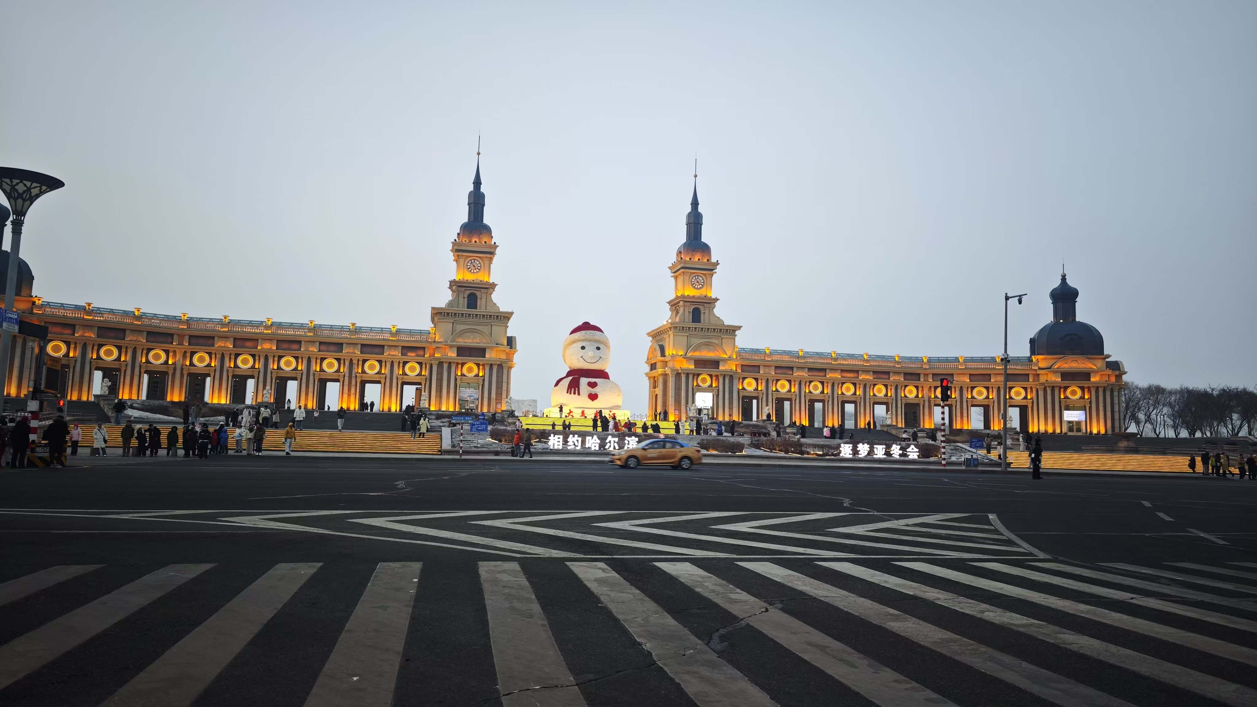 哈药六厂出来去今天的最后一站音乐长廊,大雪人就在那里,看时间还早,恰好旁边就有直通音乐长廊的公交,于是就公交过去,坐公交从另一个视角看看这个城市,近些年网上皆是东北人口流失严重,经济发展停滞不前的言论,这一次来到这里作为游客的角度来看,并没有任何相关的感受,但是跳出游客的身份,像当地人一样穿梭于城市间,确实能看到基建的不足,同时与网约车司机聊天,也确实能感觉到他们的无奈,好在这两年哈尔滨旅行爆火,给这里也带来了不少的生机和活力。一个小时的公交车到了音乐长廊,远远的就能看到可爱的大雪人在微笑示意