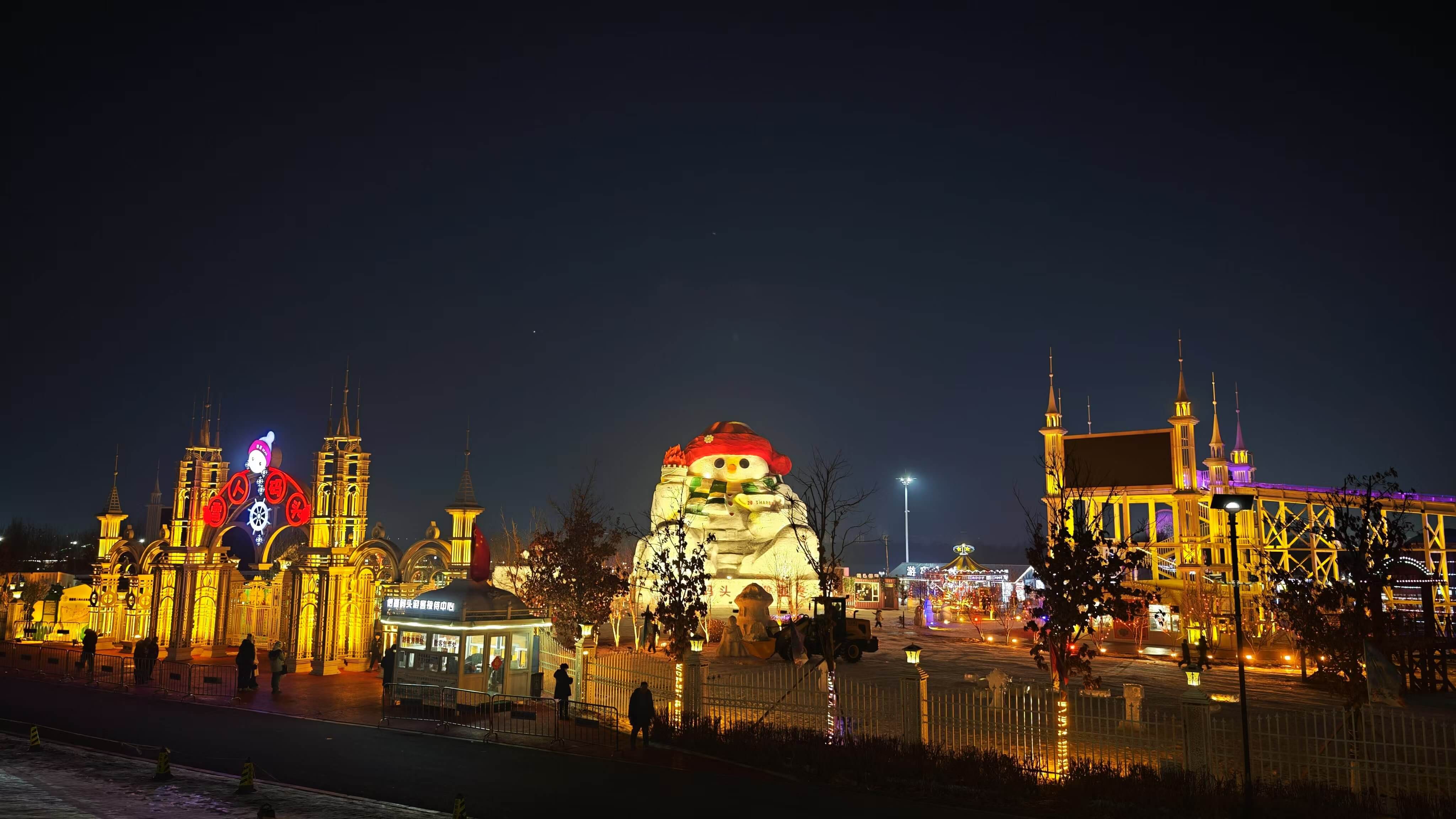 音乐长廊的背后是一个公园,从这里能一直走到雪人码头,雪人码头这也有一个大雪人,这座雪人更契合今年的亚冬会主题,头戴红帽,围着白绿相间的围脖,手握火炬,象征着哈尔滨的冰雪文化与亚冬会精神,雪人码头也是个冰雪乐园,里边有许多游乐项目,查了下门票要298元/人,雪人码头就在松花江边上,夜景同样很漂亮,看到许多人在这旁边拍照观景