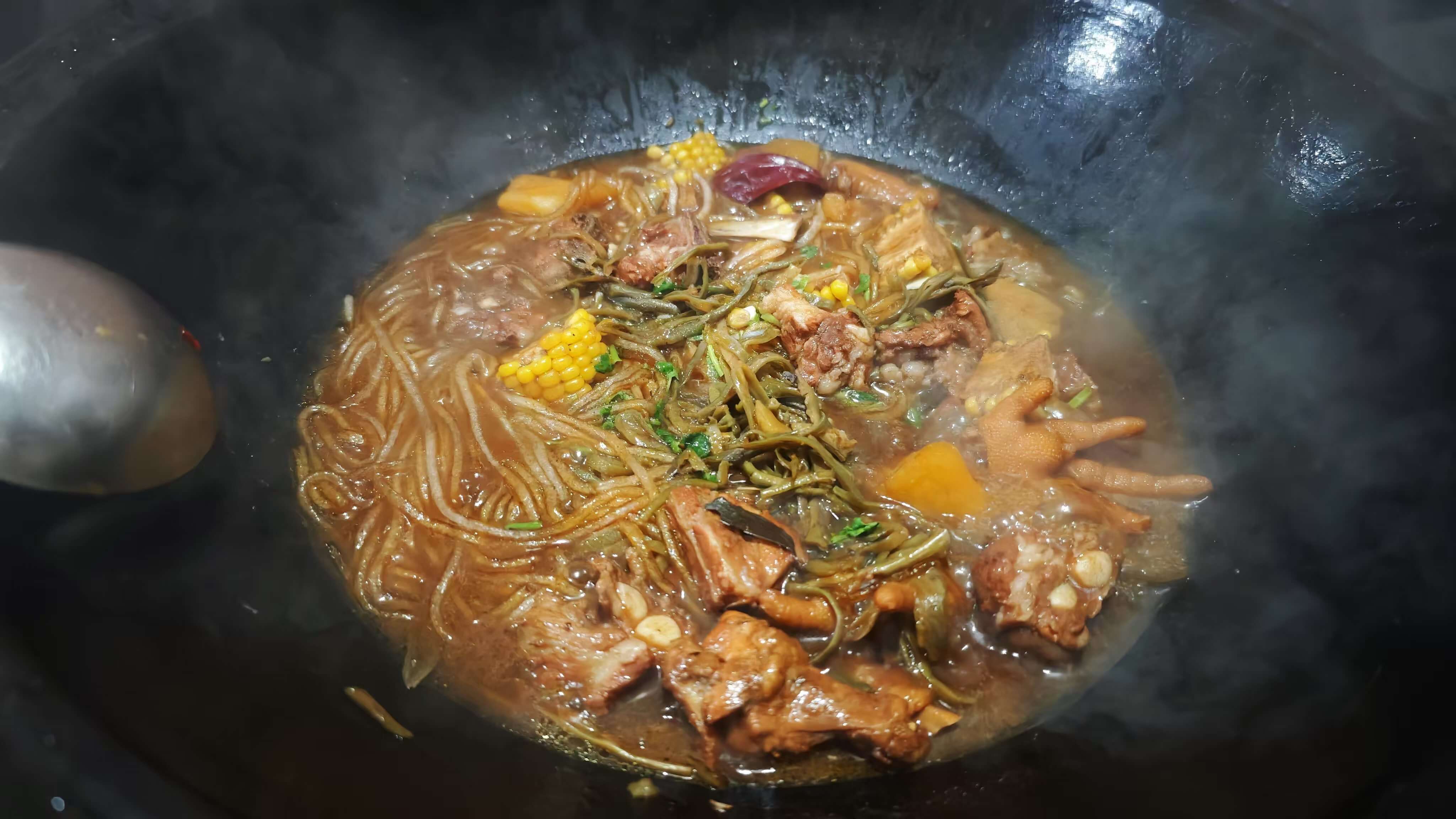 冰雪嘉年华逛了一圈,小朋友也高高兴兴的玩儿了好几个冰雪项目,又累又饿,不舍的离开了。到了东北必须吃个铁锅炖,网上找了一家,名叫山河屯,是个连锁店,看评价还不错,就这旁边就有一家店,走路过去吃,人很多,我们排队大概一小时,吃上了,味道是真不错。网上买的排骨锅套餐,108元,三个人没吃完,很实惠