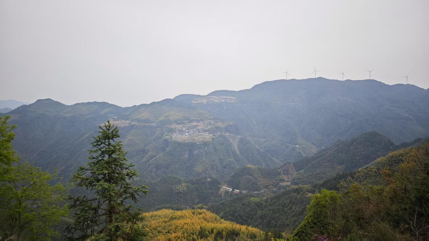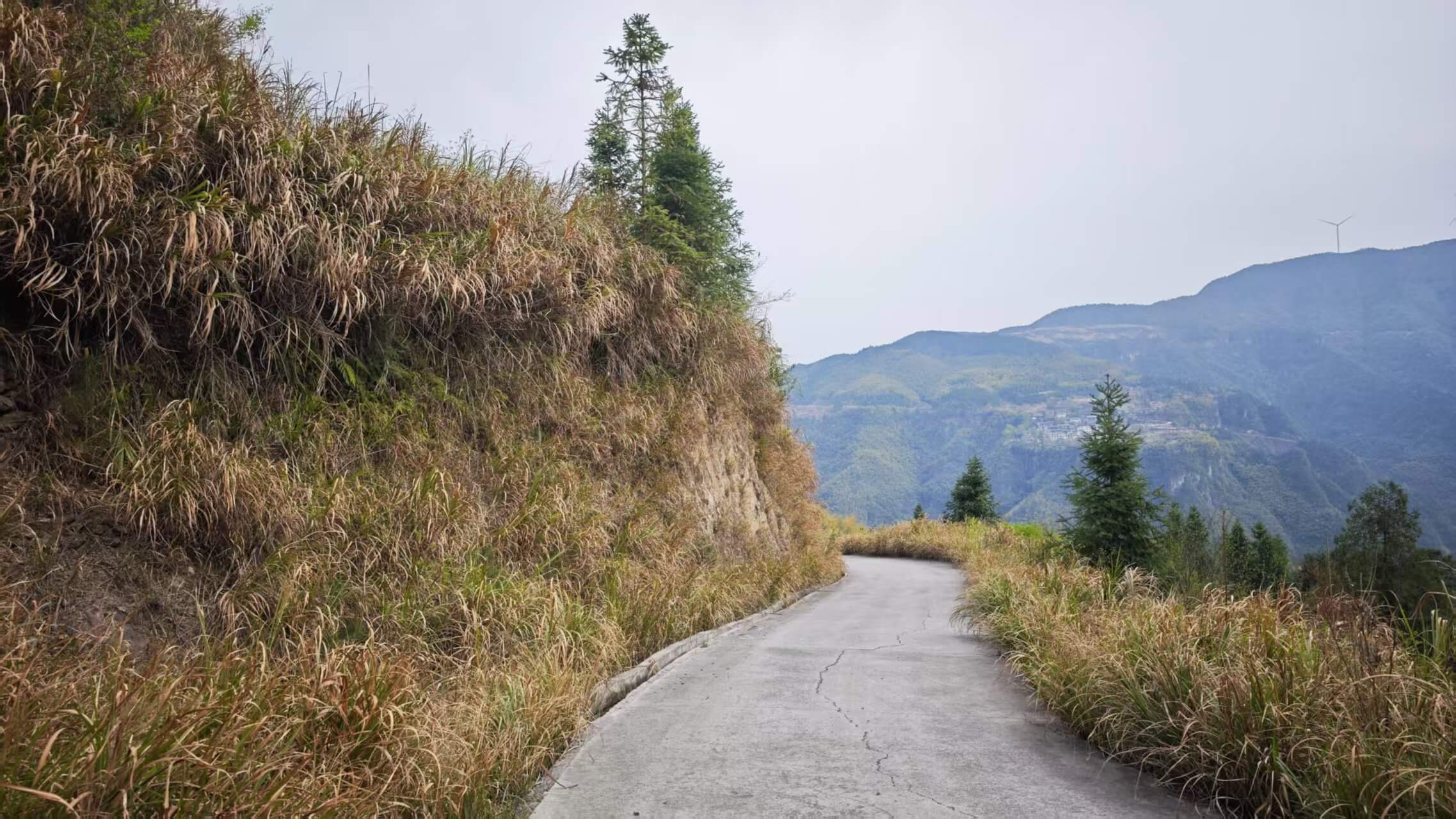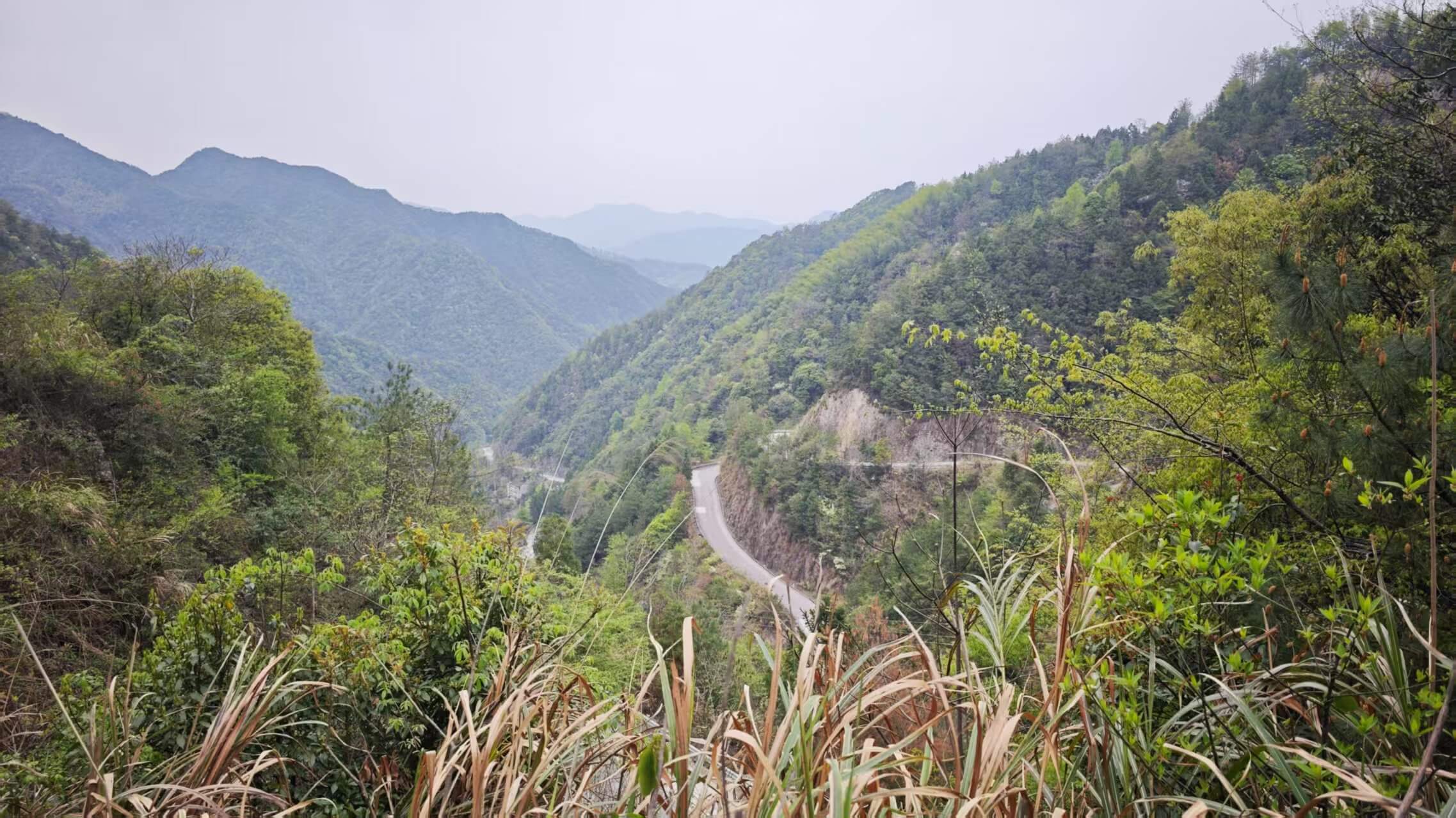 上山头这里是个很好的观景平台,也是走这一路为数不多的观景平台,从这里可以远眺对面的悬崖村,就在对面山间,隐隐约约看到的几排房子就是悬崖村了,看上去似乎不远,但实际并没有想象的那么近,中间一条山谷相隔,要到达悬崖村,需要先下再上爬一座山