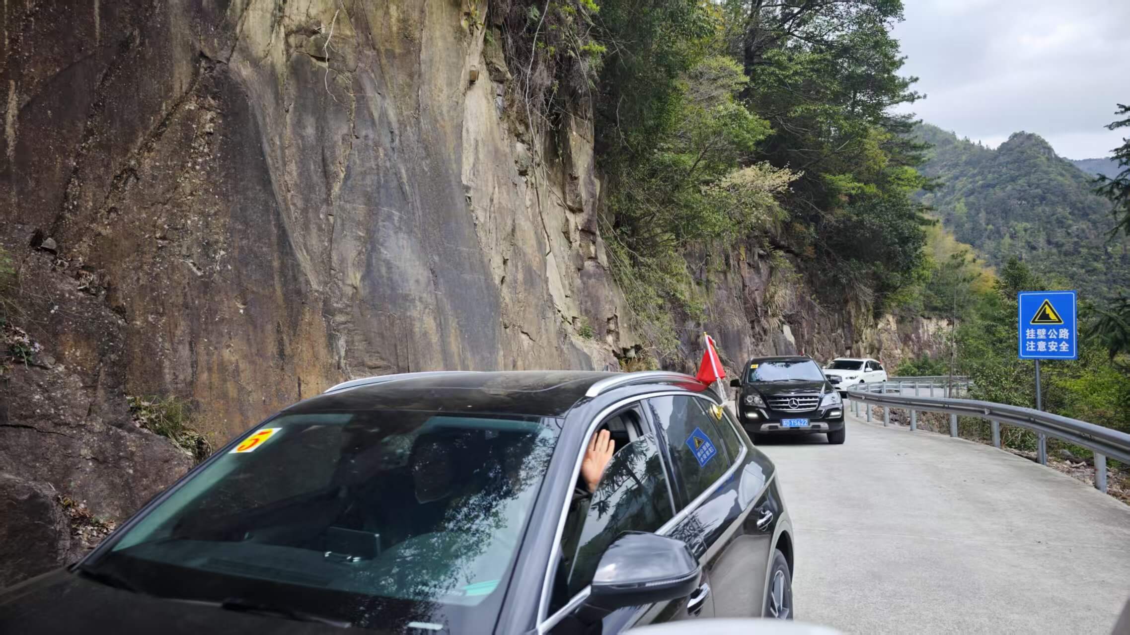 离开悬崖村,继续浙中川藏线的行程,要下山到里井坑然后走另一条岔路往前,下山途中遇到一个自驾车队,在一处稍微宽点的地方错车,让对面先走,打头的大哥说让我等一等,继续往前错不了车,他们有二十几辆车一起。看他们大概六十多岁的样子,车子虽然品牌和价值不同,但每辆车都悬挂了国旗,统一了编号,对讲机随时联系,互通有无,颇为壮观