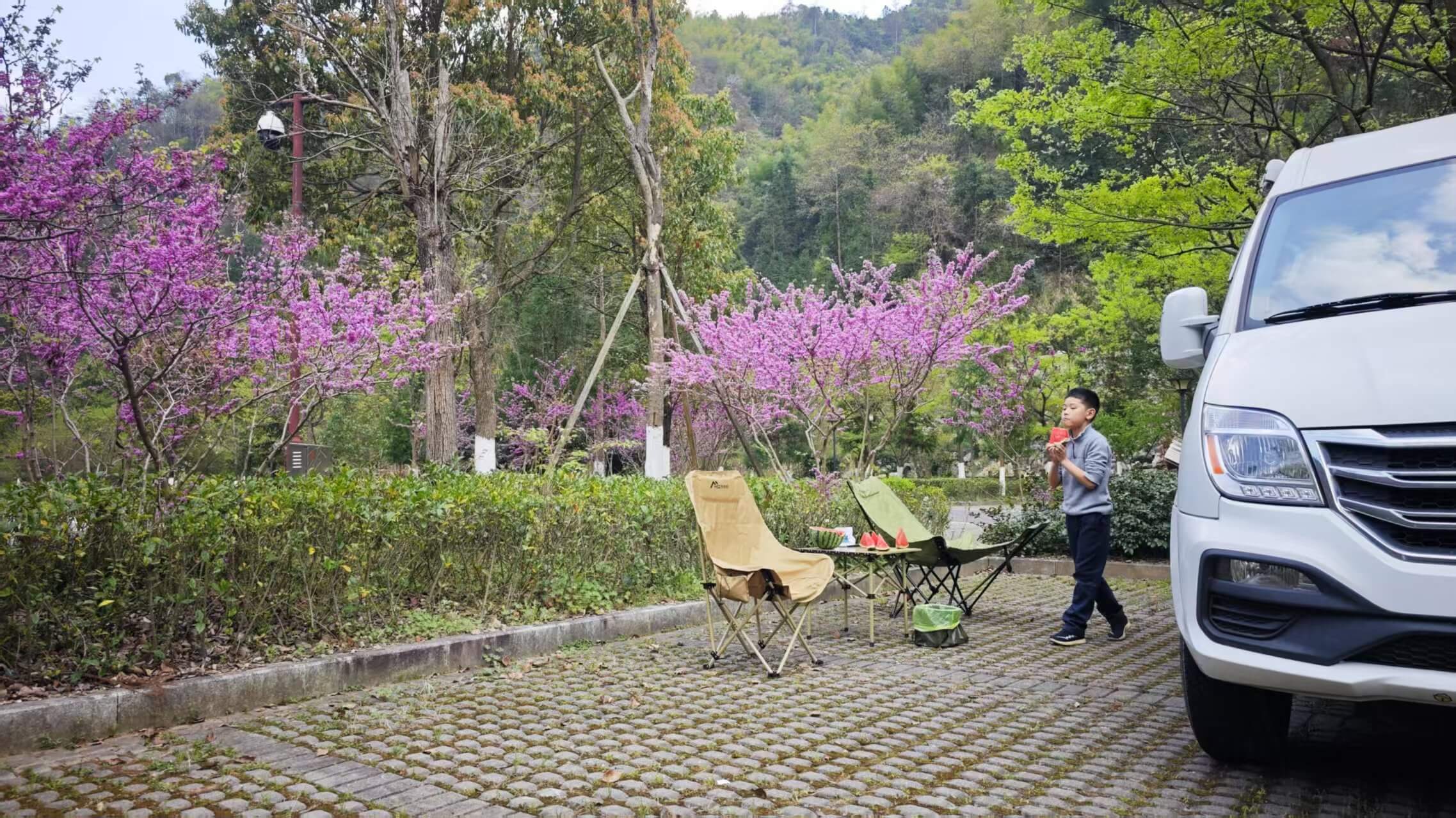 一般景区的大门离入口都有一定的距离,要坐摆渡车进去,花溪景区原本也不例外,景区大门离入口有两公里的距离,要乘坐摆渡车进去,但现在景区摆渡车并没有运营,大门也是敞开的,可以直接开车到入口处,入口处旁边有几个停车位,就这几个停车位都没有停满,可见这个景区是真的没什么游客。我们回到大门口的停车场,看这里环境很好,有几棵树开满了花,红红绿绿,特别漂亮,那就停下来欣赏一下吧,摆开桌椅,切上西瓜,休息了