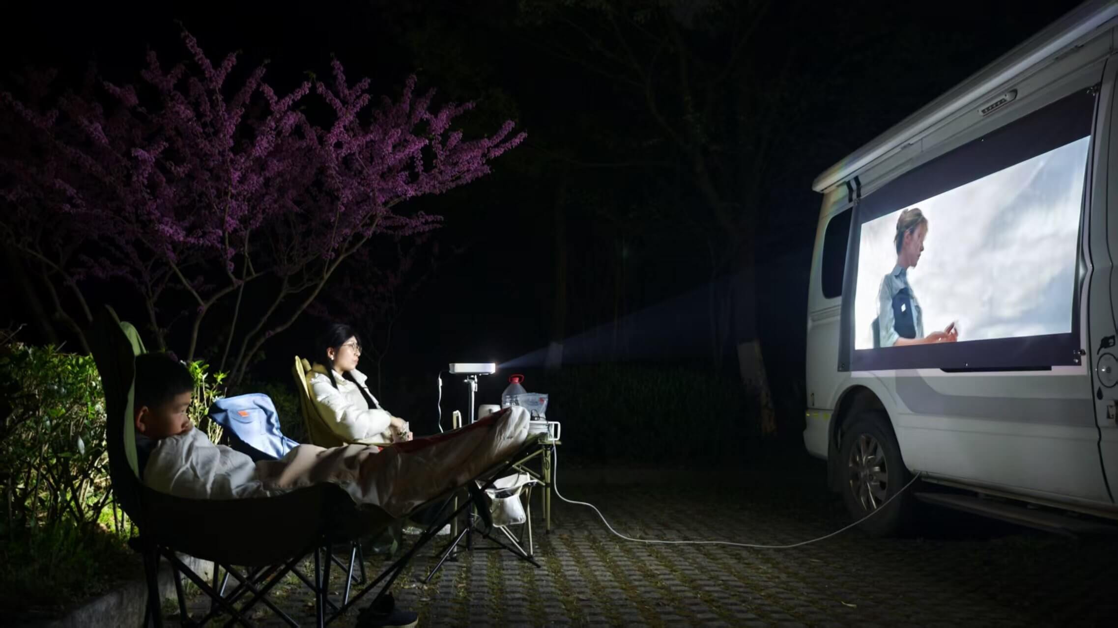 时间充足,那户外电影自不可少,挂上幕布,支起投影,此时,一树红花正竞相怒放,一轮明月正高悬天空,三人并排而坐,花前月下,一场电影,没有什么比这更浪漫