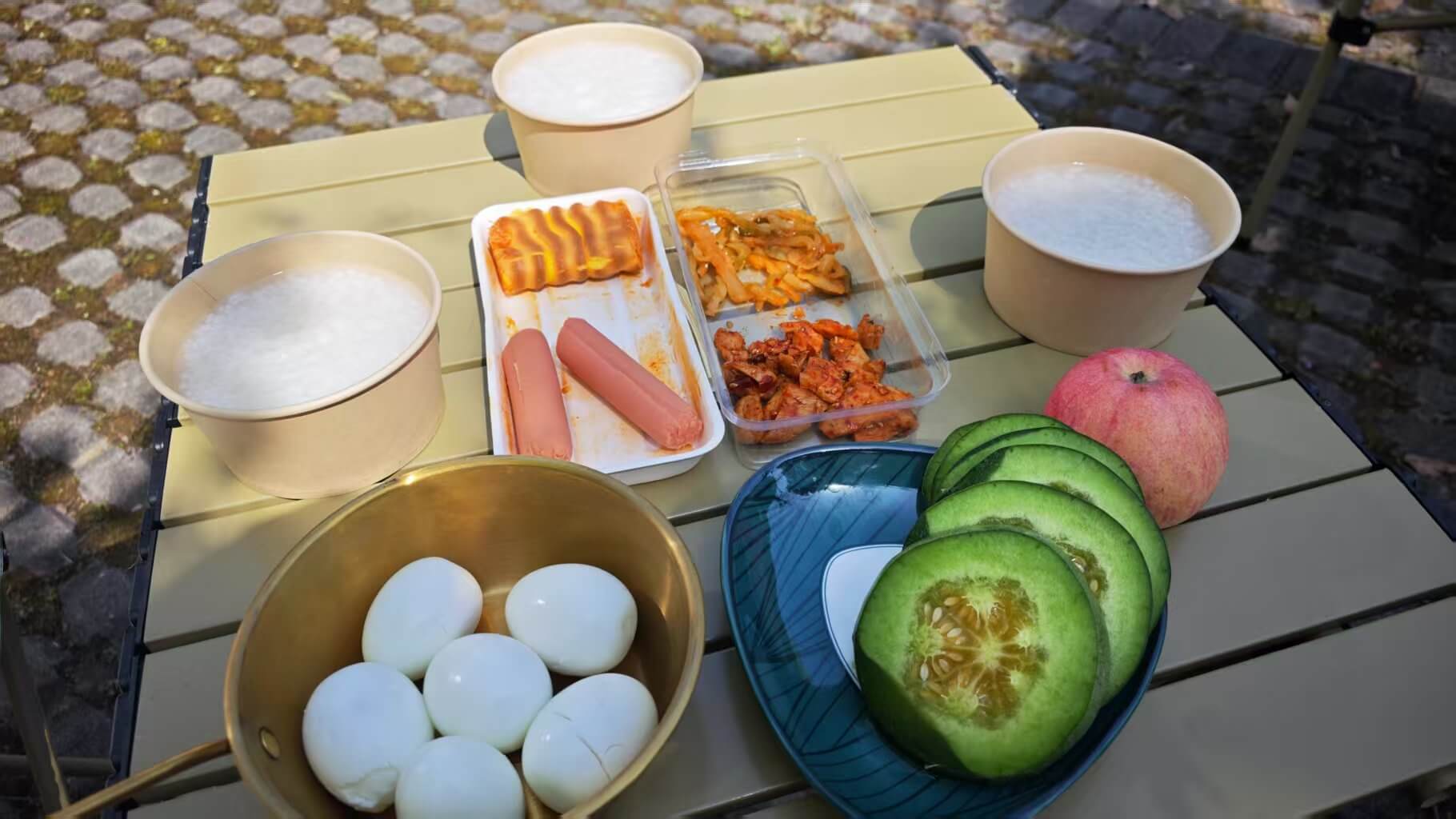 煮了一锅白粥,再加几个鸡蛋,一点面包一个火腿,配上点咸菜,还有饭后水果,也算简单营养了