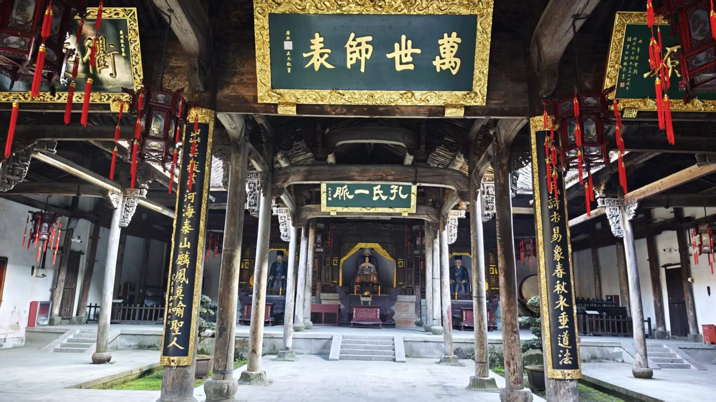 就在彩排会场的对面就是孔氏家庙,榉溪孔氏家庙坐落在榉溪村榉川南岸,始建于南宋宝祐二年,清代重建,坐南朝北,占地836平方米,整座建筑以中轴线贯穿,左右对称,由门楼、戏台、天井、正厅、穿堂及二小天井、后堂等组成,平面呈长方形。为全国重点文物保护单位,一般此类建筑都称之为祠堂,之前去皖南古村就看到过好多类似的家祠,但这里的叫家庙,我查了下这主要是因为孔子地位尊崇,得朝廷恩准,故称之为家庙