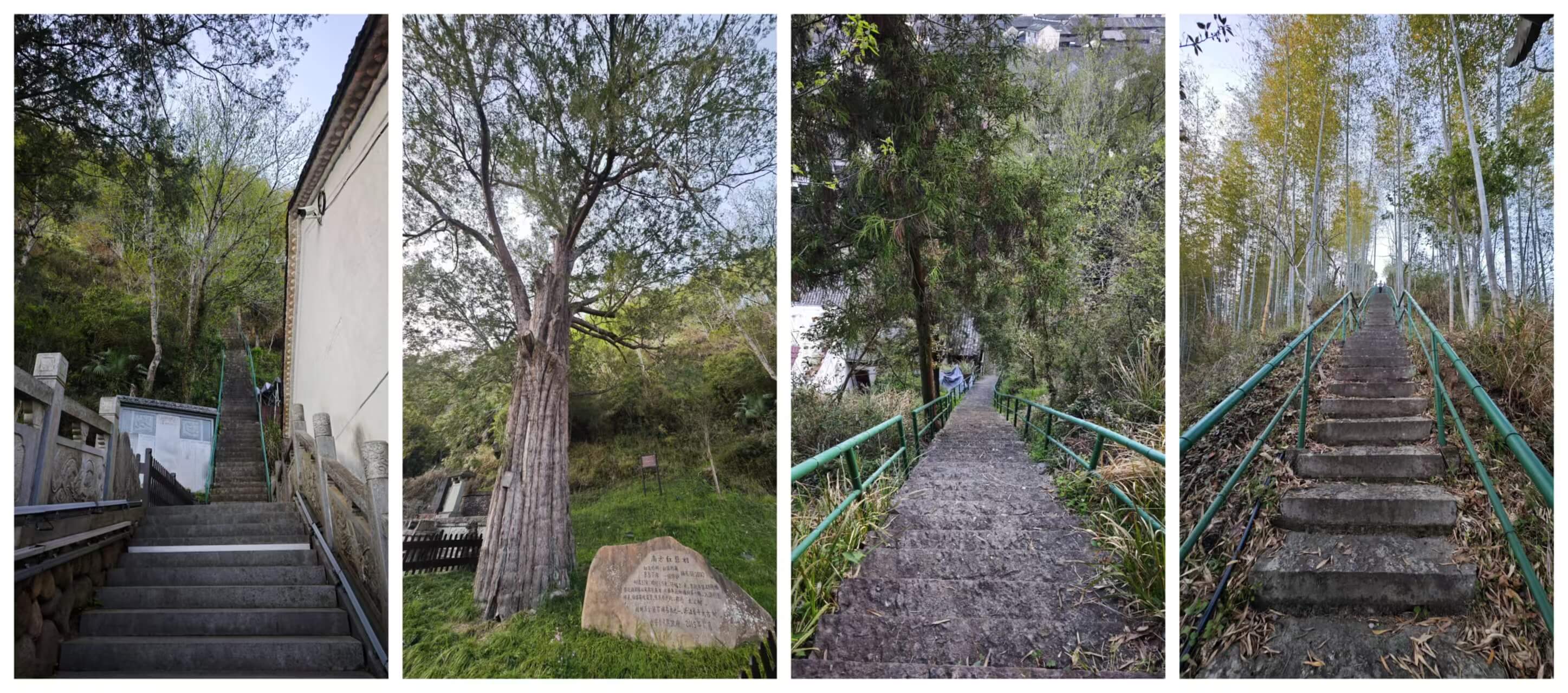 古树边上有一阶梯,可以上山,阶梯很陡,接近七八十度的样子,上下都要手扶旁边的栏杆,可能一不小心就要滚下去,阶梯不高能登上山顶,山顶有一亭子,视野很好,可以俯瞰整个榉溪村