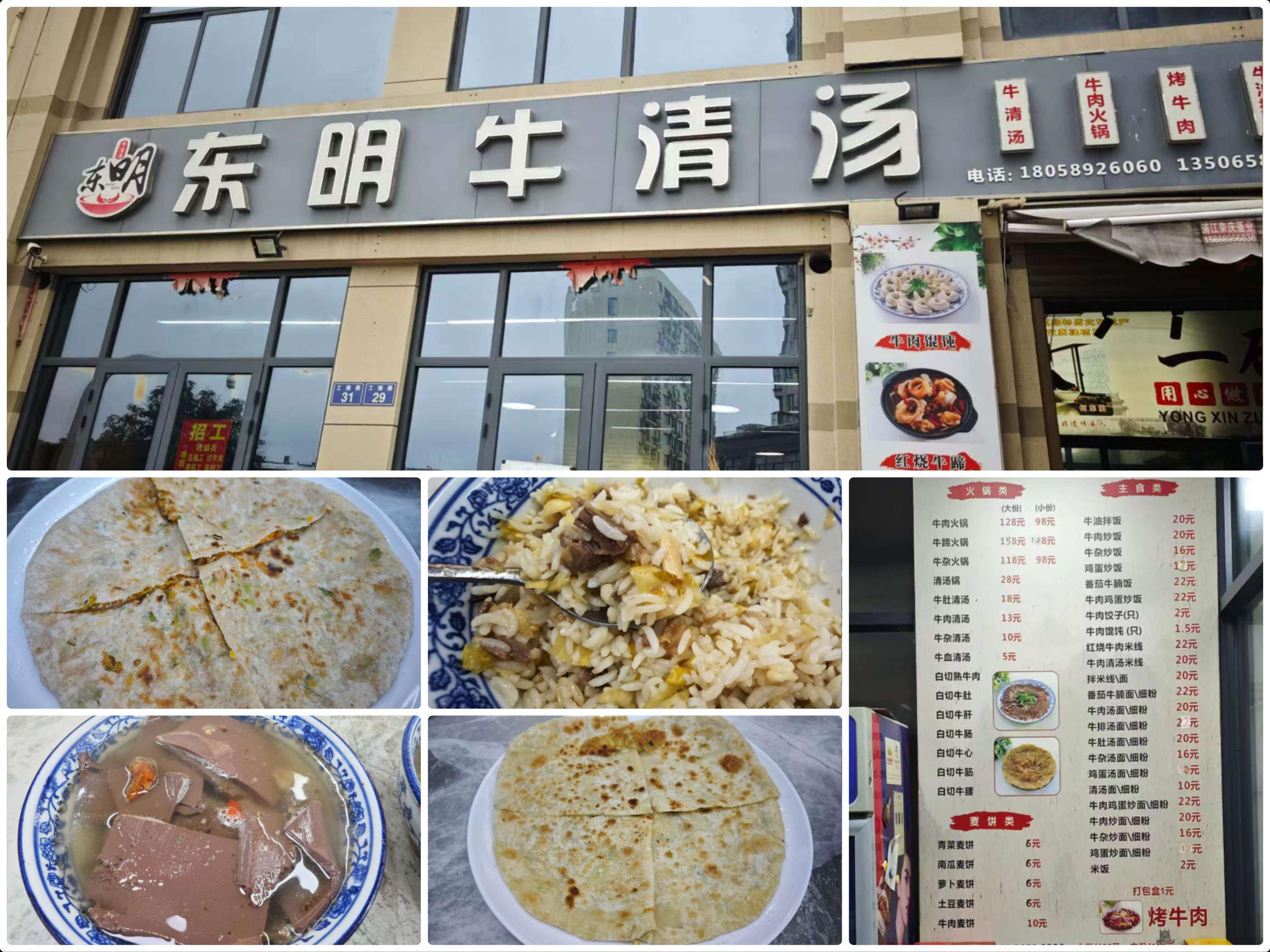 浦江收费站下高速,已经下午一点,饿了,先去找吃的。收费站下来是黄寨镇,离县城还有15公里的距离,误打误撞吃了这家东明牛清汤,很不错。后边查了下攻略才发现这家店榜上有名,浦江的特色美食莫过于牛清汤和麦饼,这家店正好都能吃到,点了牛清汤、牛油拌饭和三个不同口味的麦饼,好吃,尤其是牛油拌饭,米饭裹满了牛油和牛肉的酱汁,配着清爽的酸菜,吃起来清脆爽口还不腻,一碗牛清汤,加了牛杂和牛血,看上去很清淡,但喝起来很香