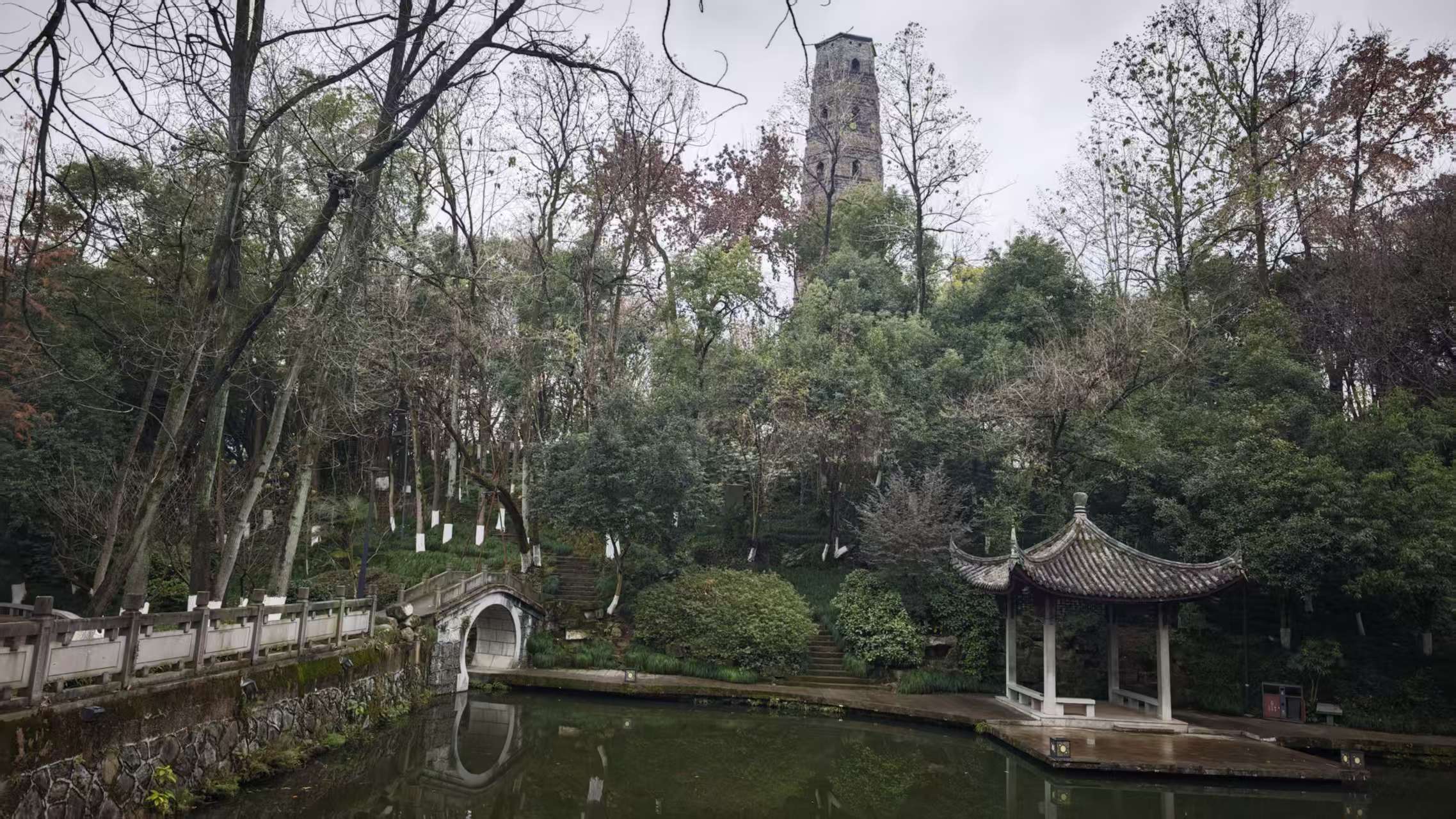 今天的天气不好,淅淅沥沥的飘着小雨,但并不影响游玩儿的心情,吃好饭前往浦江县城。第一站去塔山公园,公园以北宋龙德寺塔为核心景观,现存七层六面砖木结构的古塔及800年古樟树、900年古槠树等历史遗存。直接开车到公园门口,路边有免费停车位可以停车,公园没有高高的围墙,站在路边就能看到公园内优美的环境
