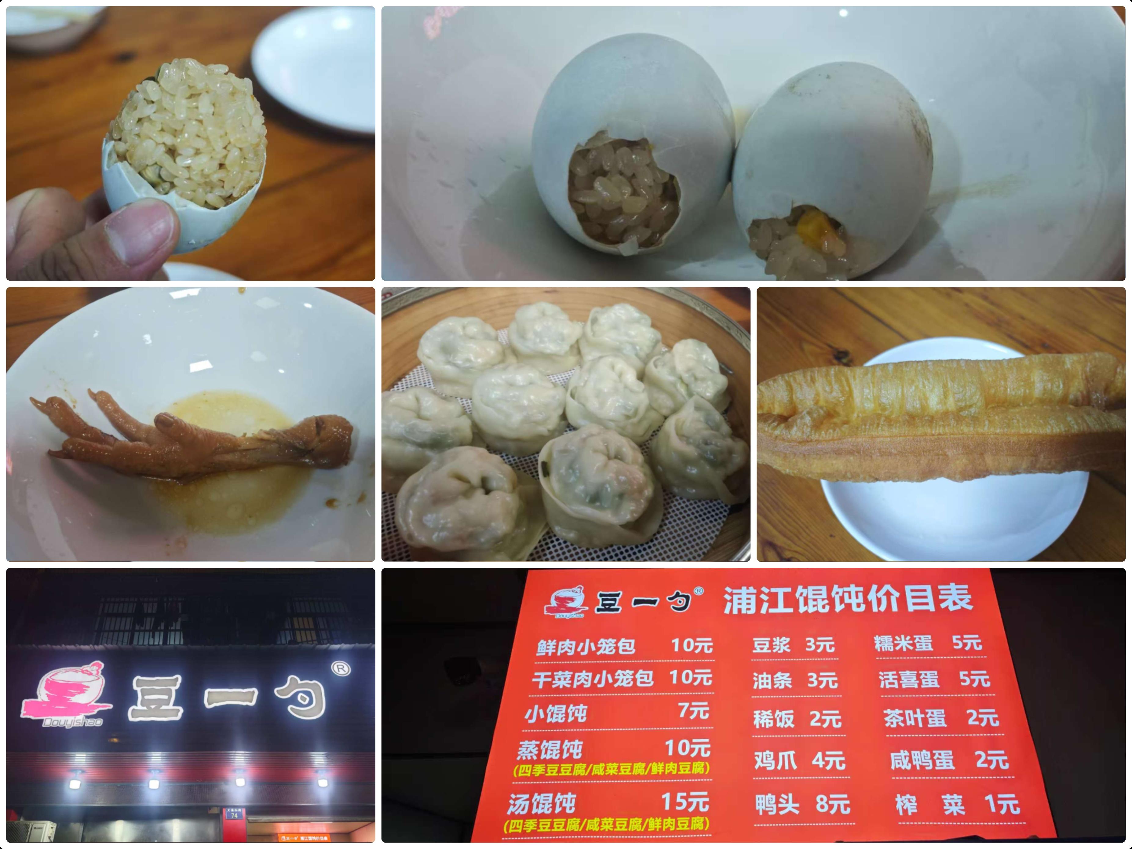 绕着湖边走了一大圈,走到天黑,走到又饿了,继续去寻找美食,网上找了这家评价很高的豆一勺浦江馄饨,这家店主要卖豆浆、油条、小笼包之类的,像是个早餐店,但是营业时间是下午5点至凌晨4点,把早餐卖成了夜宵了,价格不是很贵,食客很多。我们点了豆浆、油条、蒸馄饨、糯米蛋等。有被糯米蛋的味道惊艳了,糯米蛋使用生咸鸭蛋,敲开小口倒出蛋清,保留完整蛋黄在壳内,然后塞上糯米、香菇等配料,上笼蒸至糯米软糯、蛋黄流油,吃起来口感丰富,咸香适宜,非常推荐