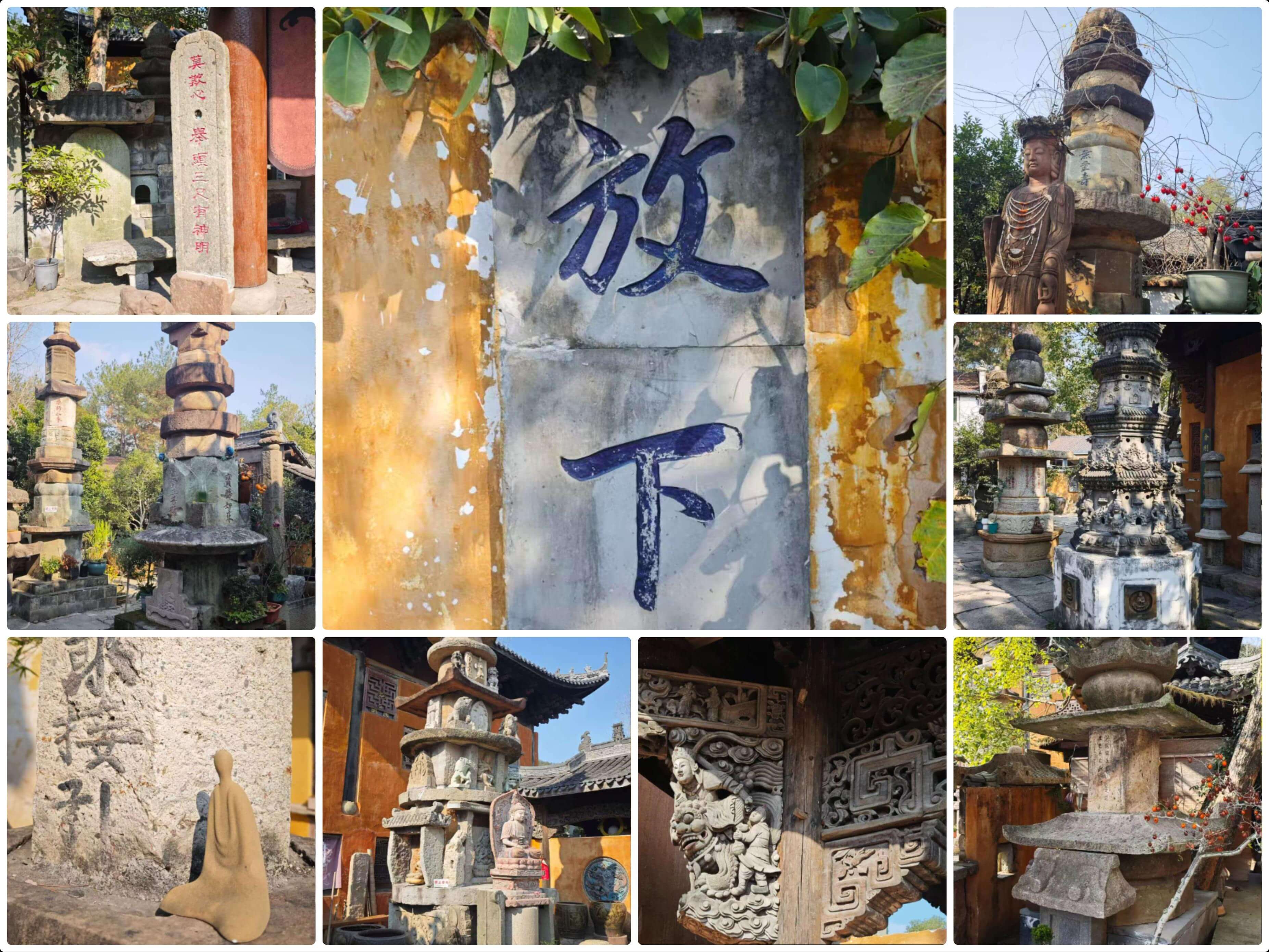 寺庙内陈列大量明清碑刻、石雕、残塔构件,据说均由寺庙师傅多年从浙中各地收集而来,有明代石塔基座、清代经幢残件、民国木雕佛龛等,这些老物件散落在寺庙的各个地方,所有不同类型不同年代的物件随意组合,我并没觉得杂乱,反倒是感觉一切都刚刚好,组合和位置也都恰到好处,就像他原本就应该属于这里