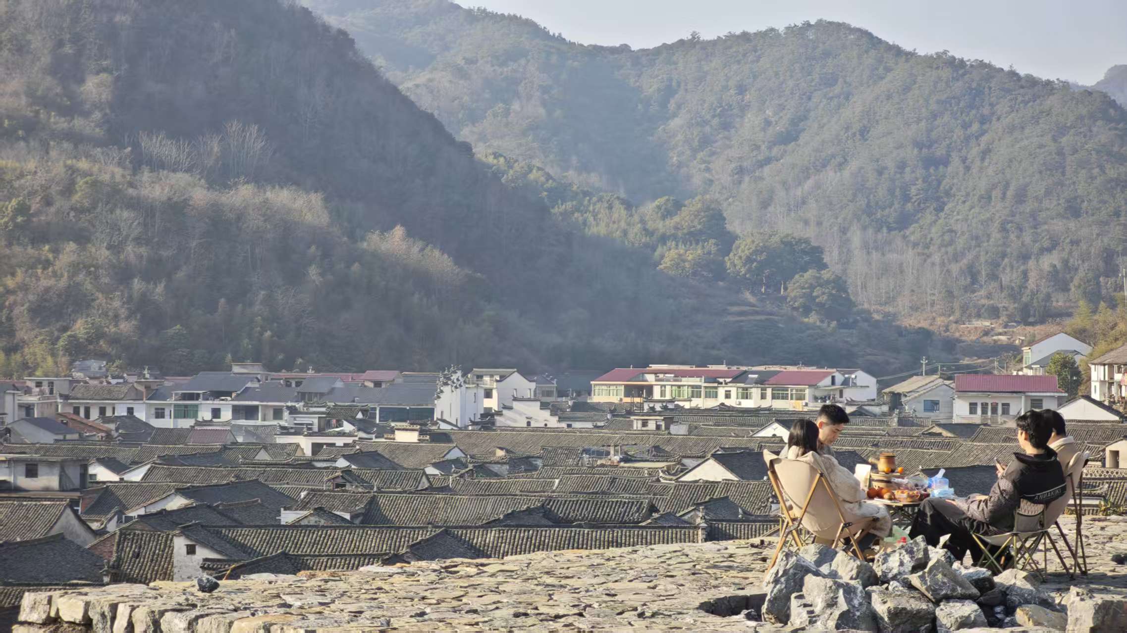 天气虽冷,但有阳光,观景平台上还有几个朋友在围炉煮茶,聊聊天,晒晒太阳,很是惬意。古老的村落正好作为这种现代休闲方式的背景版,带来极强的古老与现代的视觉冲击