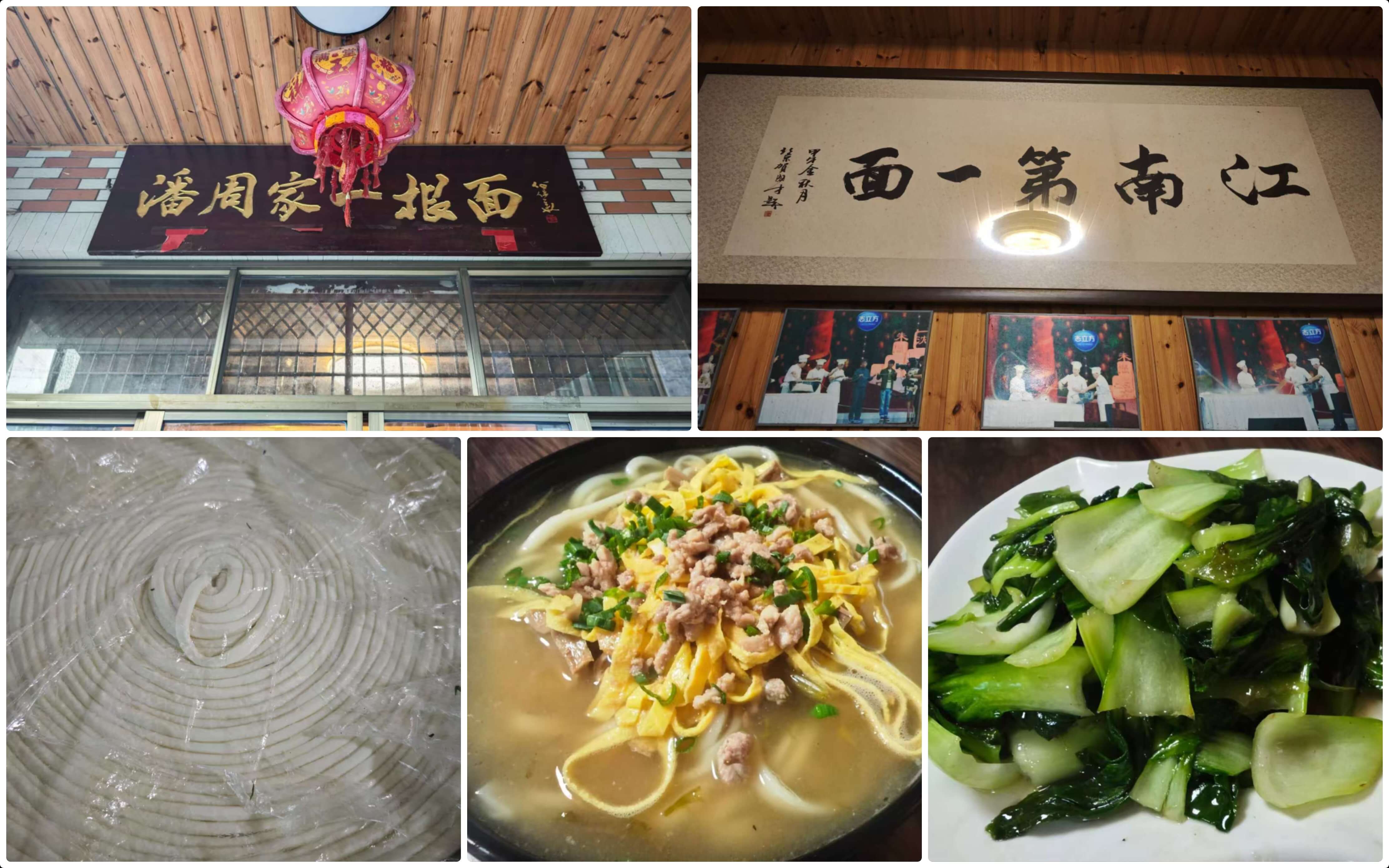 这趟翻山越岭的到潘周家,并不仅仅是为了参观潘周家的古建筑,而是想要尝尝村里传承六百余年,曾上过央视舌尖上的中国的非遗技艺「一根面」。一根面,顾名思义就是:一碗面只有一根完整不断的面条。一根面单根长度可达千米,以长、细、韧、滑著称,象征长寿吉祥。到了潘周家看到了好多家卖一根面的店,一时之间竟然不知道选哪家,跟着村子里的指示牌来到了这家,名字就叫潘周家一根面