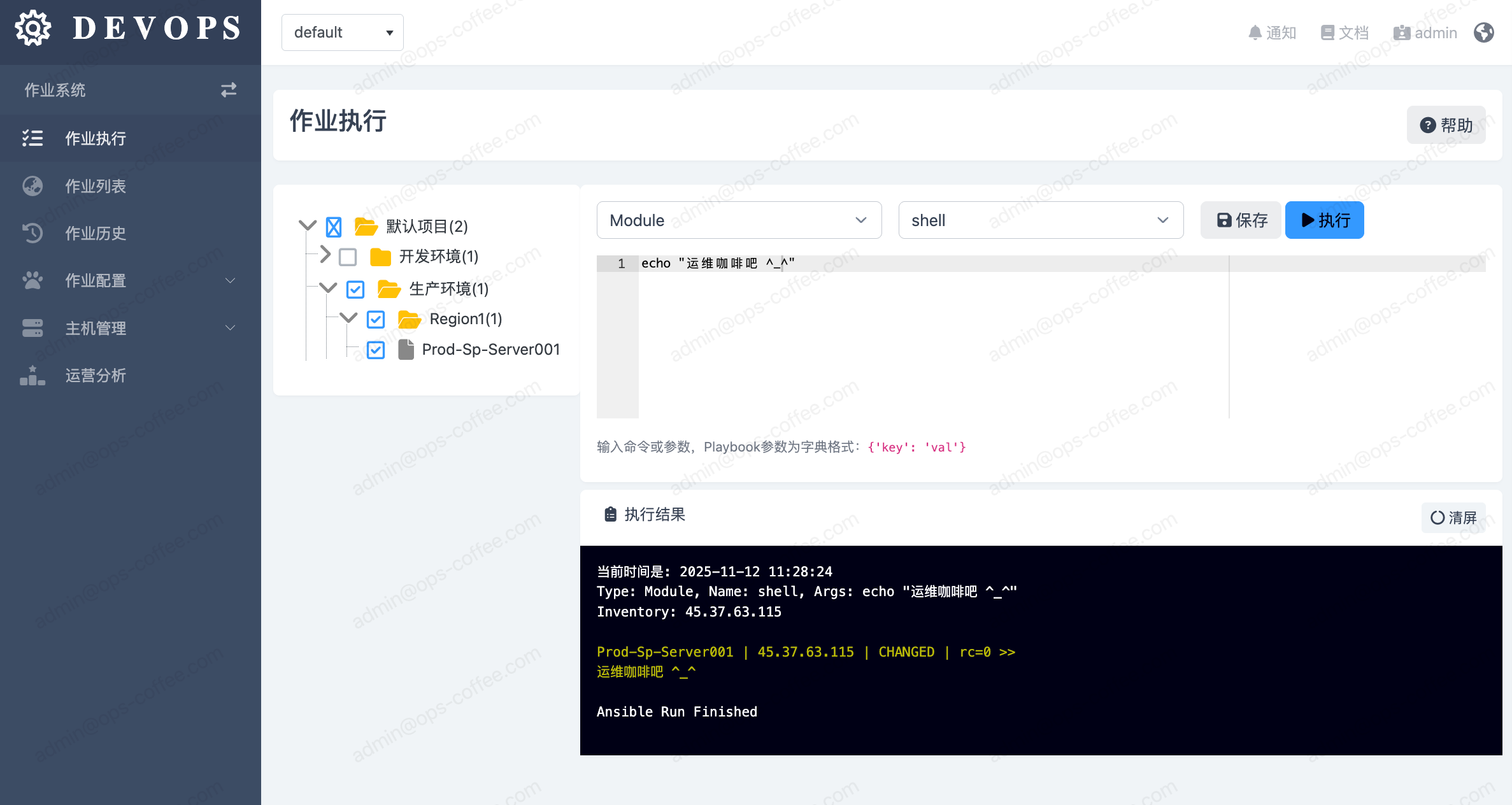 shell、copy、yum等模块)来执行一次性任务,如快速排查问题、分发临时文件等。所有执行受命令过滤规则的约束。核心价值:提供了传统ansible命令行的灵活性,但又享受到了CMDB选主机、安全凭证和命令过滤带来的便捷与安全。