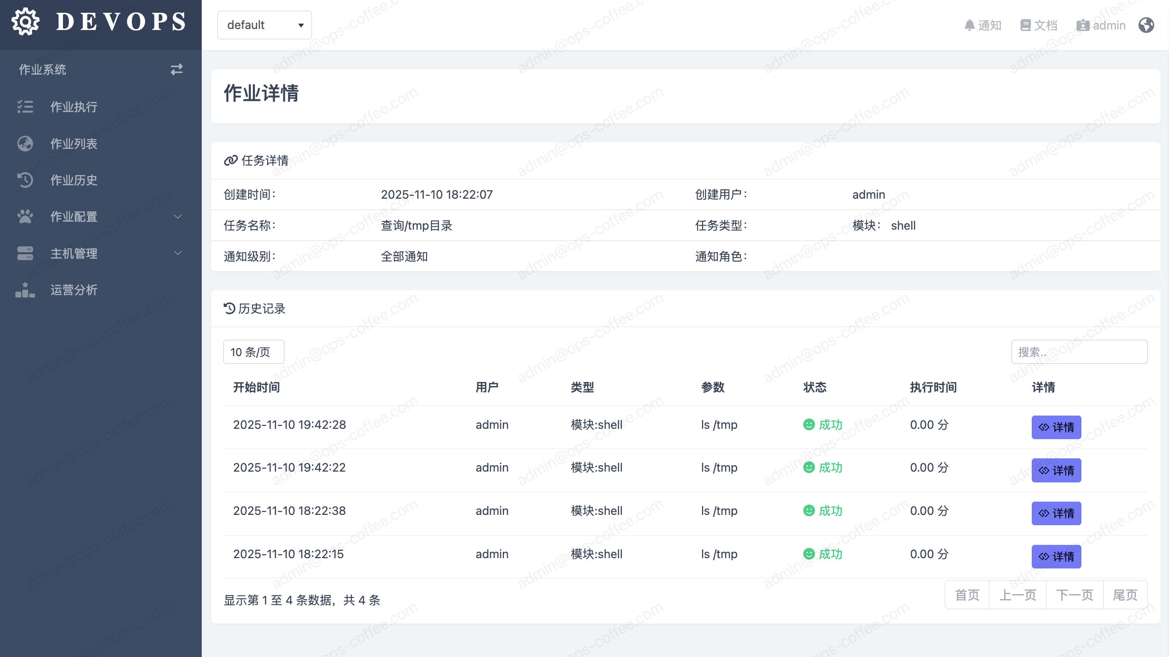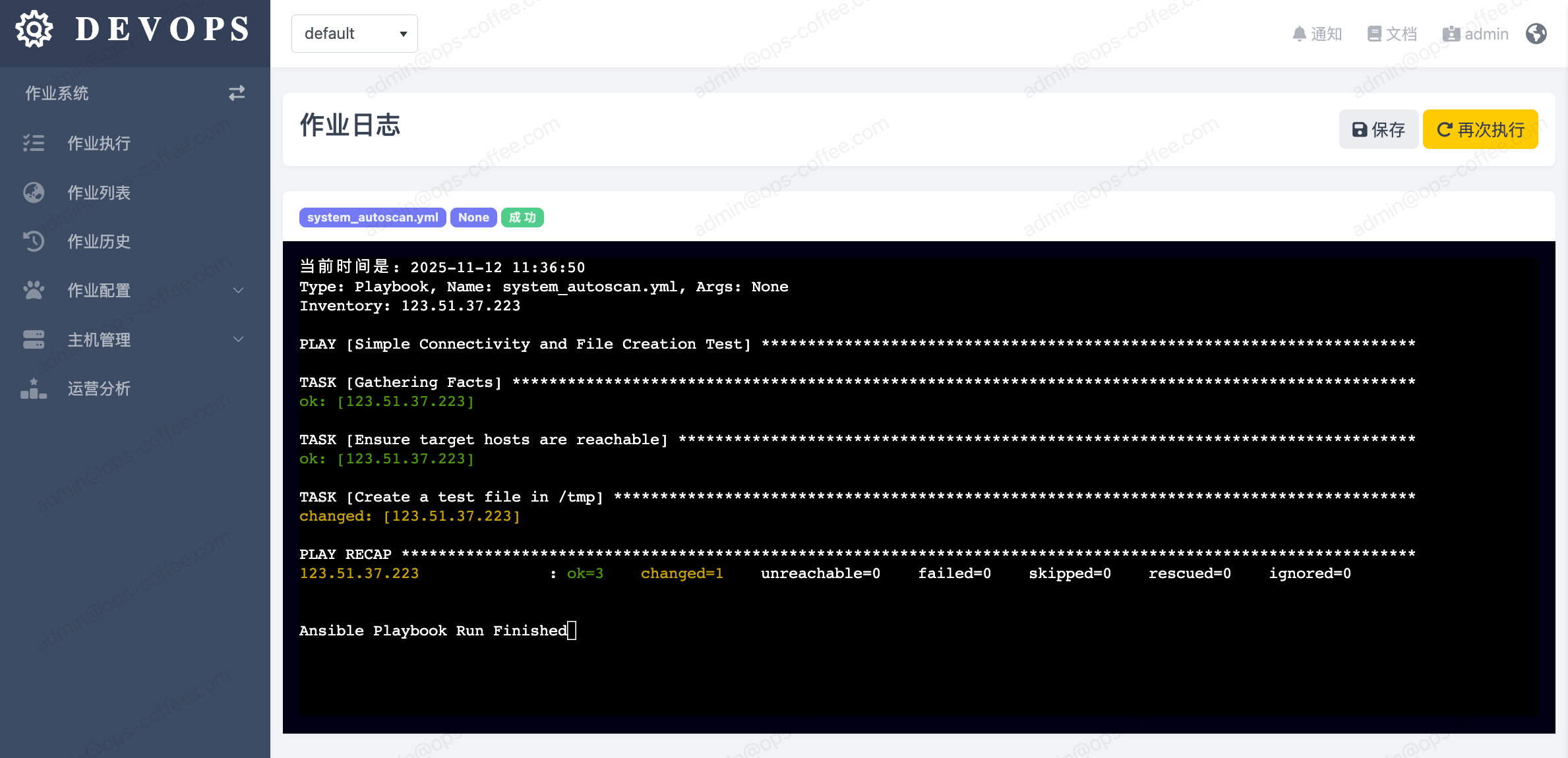 进行中、成功、失败等)、耗时以及 完整的 Ansible 标准输出/错误。核心价值:提供100%的可追溯性,是安全合规的基石。同时,支持对失败任务的一键重做,极大提升了排错效率。