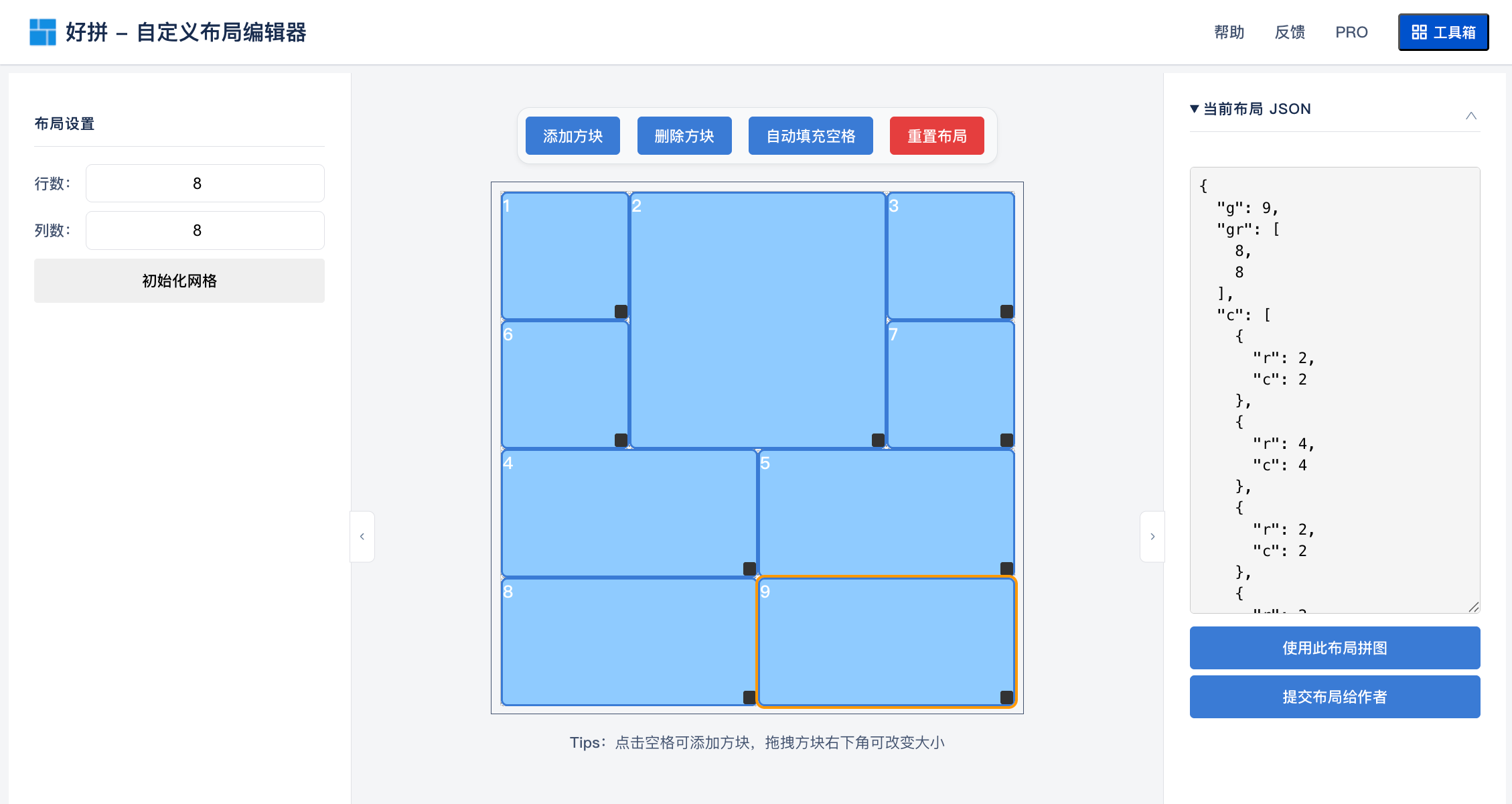 自定义布局编辑器编辑好的布局,除了直接使用其进行拼图外,还可以点击右侧的「提交布局给作者」,会自动复制布局代码并打开布局提交页面,直接Ctrl+V粘贴即可提交。我会不定期择优将其添加至默认布局中,你的创意值得被更多人看见