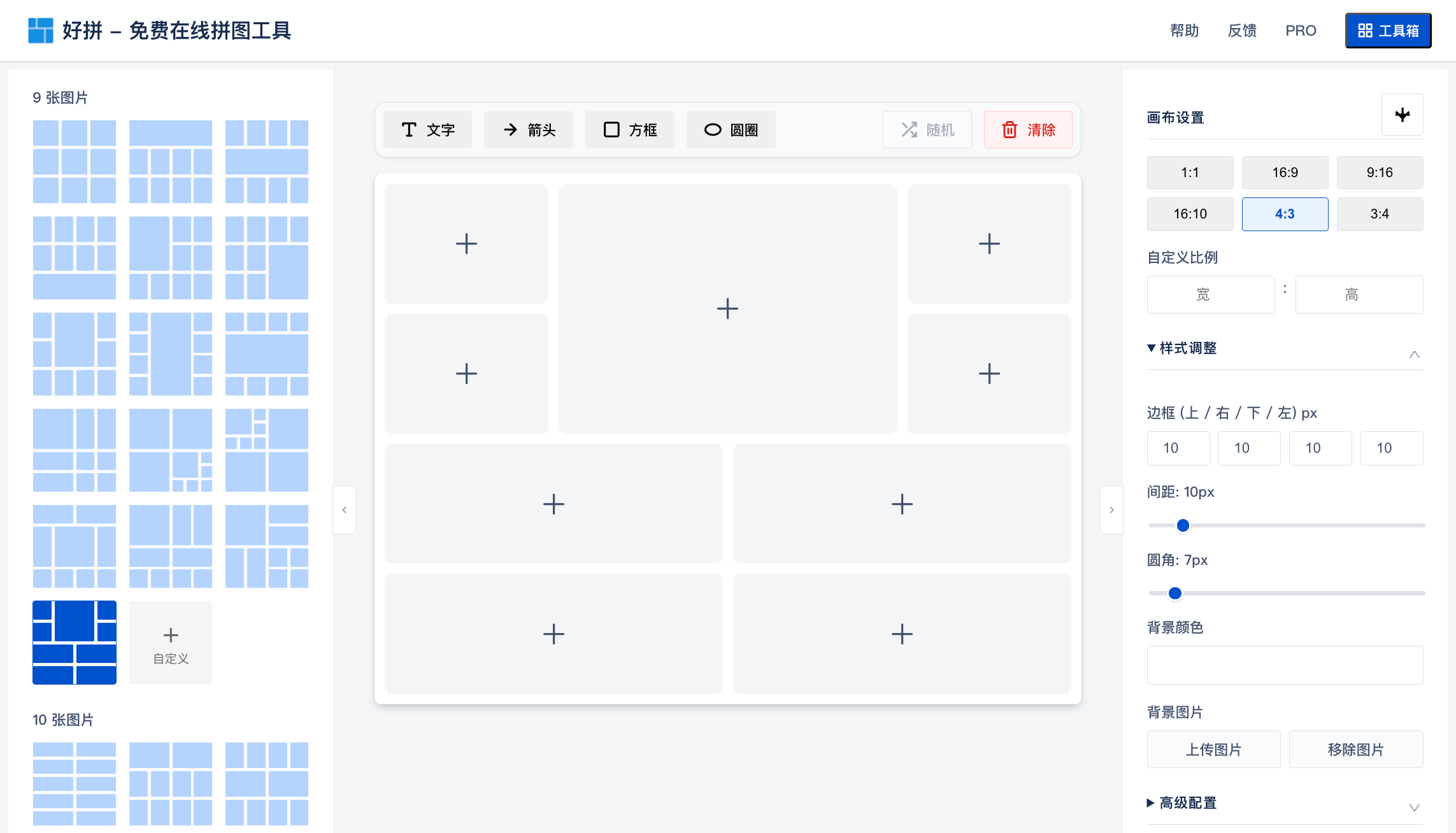 为了解决这个问题,又与AI通力合作,经过数天的奋战后,自定义拼图布局终于上线了。自定义拼图布局提供了一个空白的画布,你可以在这个空白的画布上,随意的释放你的想象力,打造出自己独特的满意的拼图布局,并且可以基于这个布局进行拼图,如果你愿意的话,也可以将这个你打造的创意布局提交给好拼,我将择优将其添加至默认拼图布局中,让你的创意被更多的用户欣赏和使用