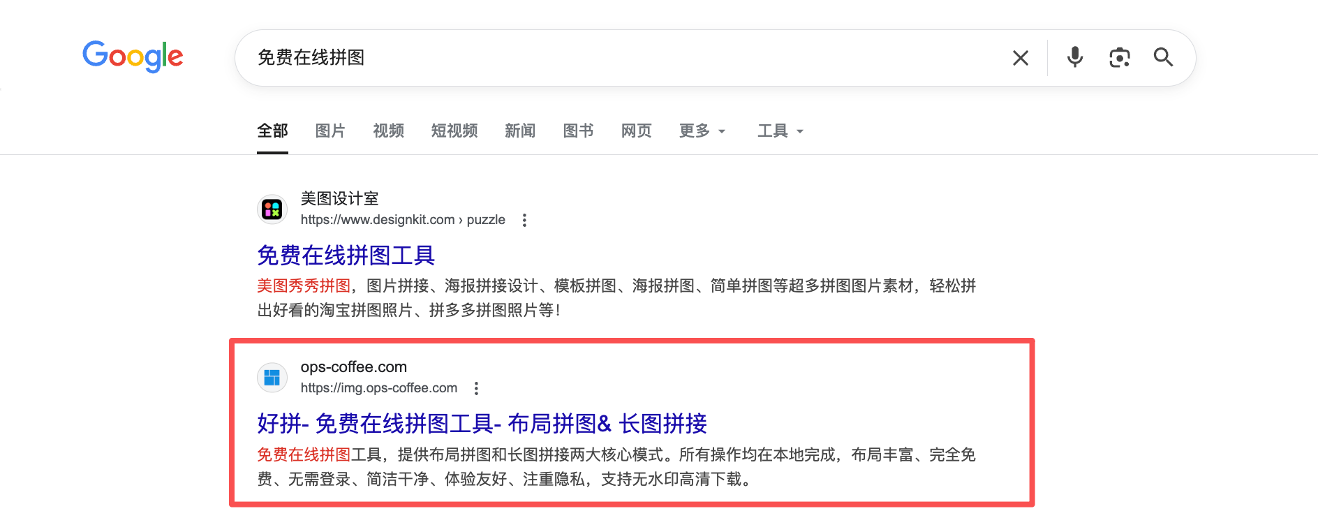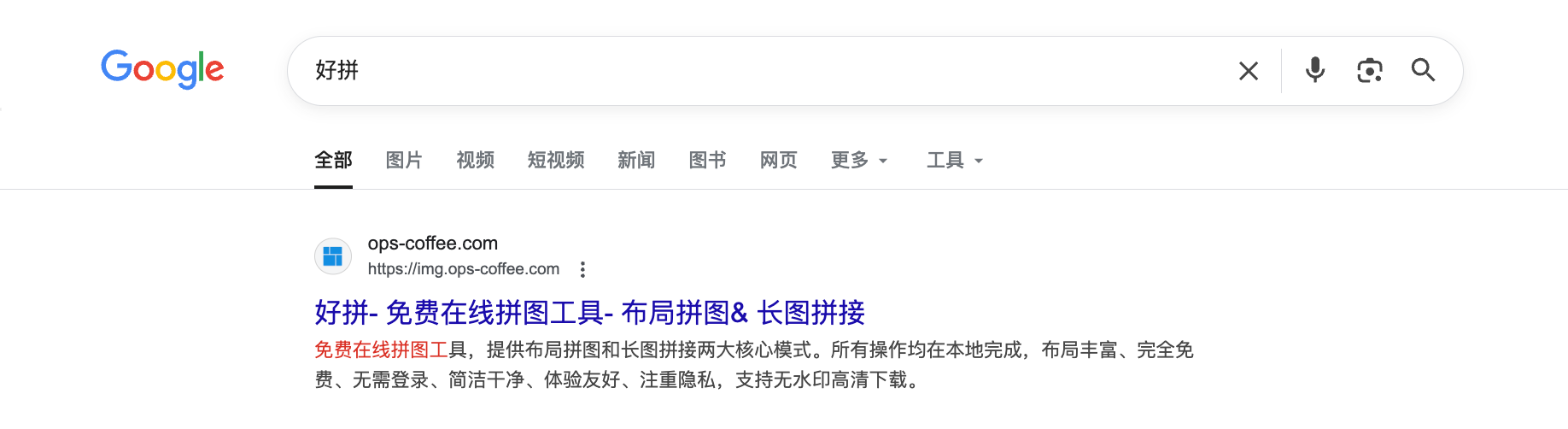 今天早上,我突发奇想,在谷歌搜索框里输入了「免费在线拼图」,想看看能不能搜到我开发的免费在线拼图工具好拼。按下回车键,结果给了我一个巨大的惊喜,我的网站不仅被收录了,而且排名高居第二!