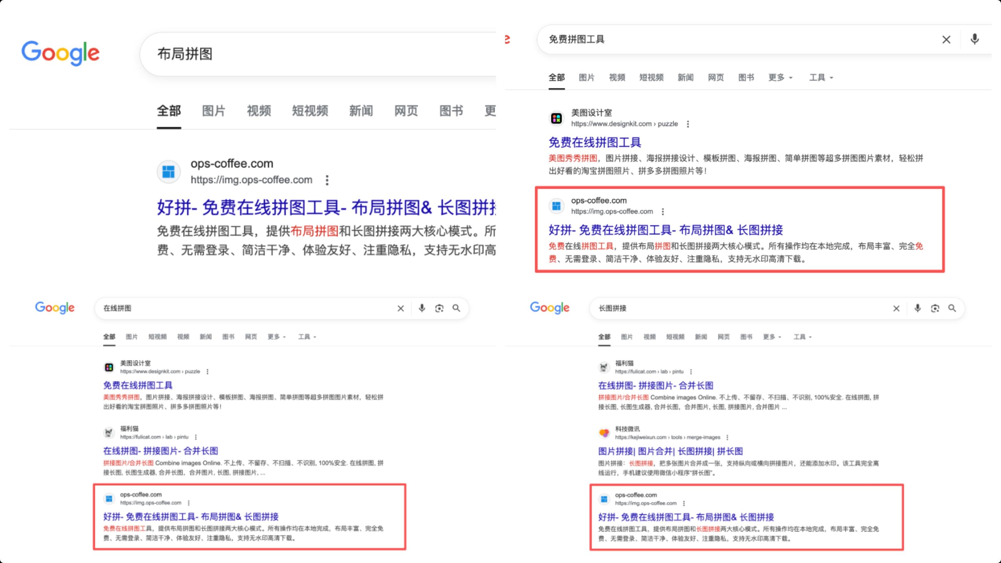 接着,我几乎把所有相关的核心关键词都试了一遍,包括「在线拼图」、「布局拼图」、「长图拼接」和「免费拼图工具」等。结果仍令人振奋,好拼在这些关键词下的排名都非常靠前,基本都在第一页的头部位置