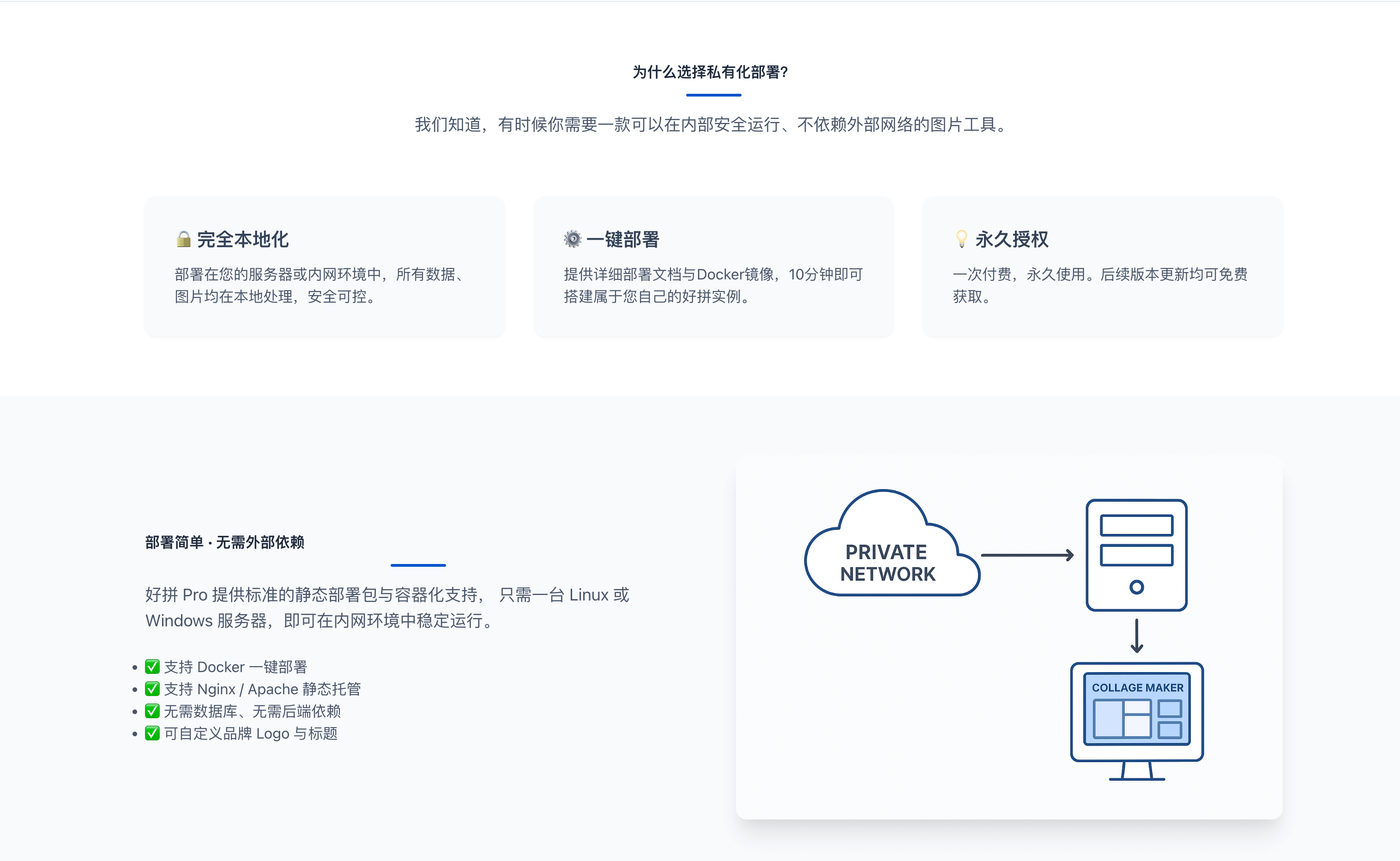 在Pro版中,用户可以在自己的服务器或企业内部网络中搭建好拼实例,打造一个安全、独立的拼图环境。我们提供了详细的部署文档和Docker镜像,如果不熟悉技术,也可以由我们远程协助部署,全程只需约10分钟。这意味着你可以轻松地在Linux或Windows服务器上搭建属于自己的拼图工具,甚至可以部署在公司服务器、设计部门或个人 NAS 上,让团队随时高效协作