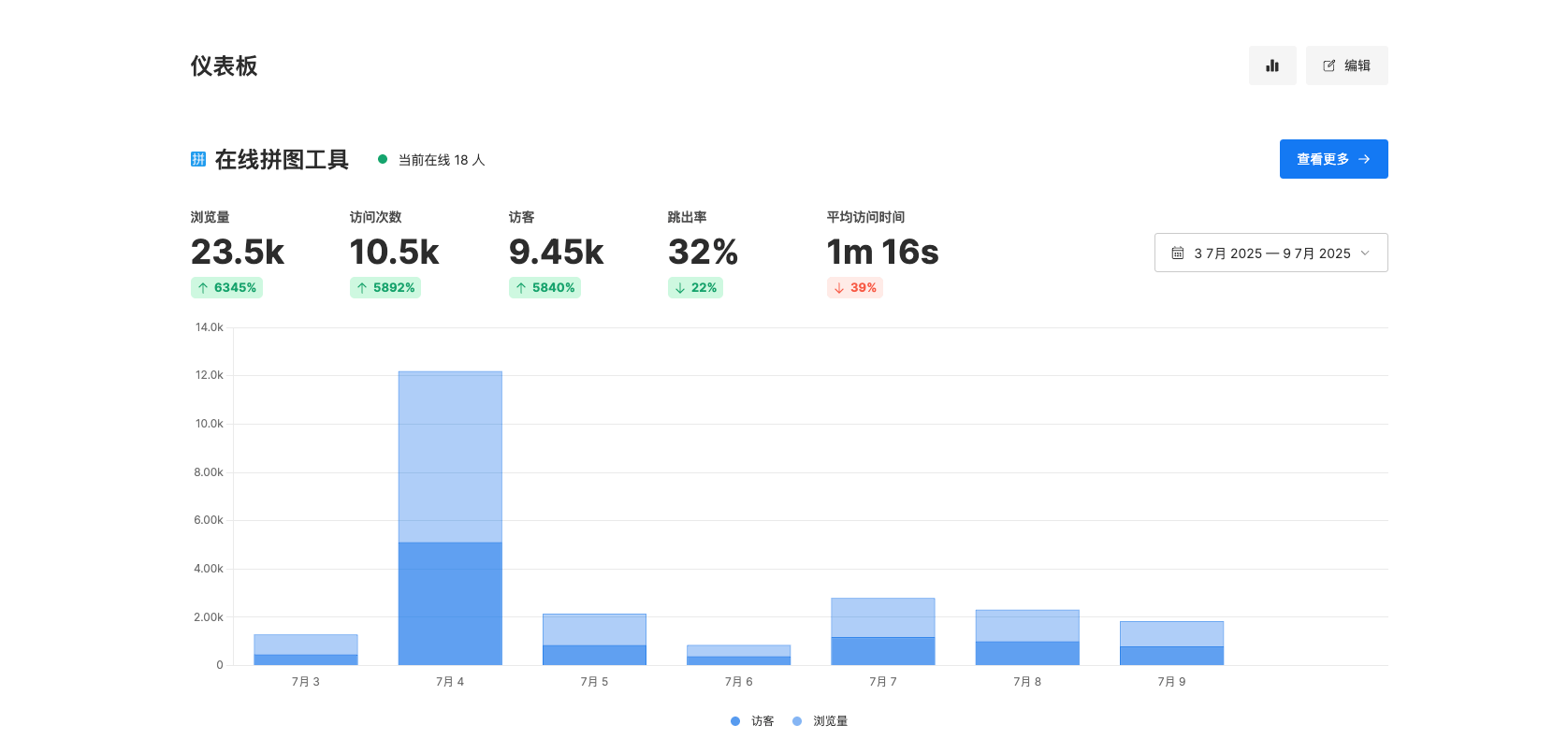 我的免费在线拼图工具已经上线一周多的时间了,接入数据统计正好满7天,在朋友们的支持下,7天时间已经有9.45k用户访问了10.5k次,共计斩获了23.5k的浏览量,远远超过我个人的预期,还是很欣慰的,感谢大家的偏爱